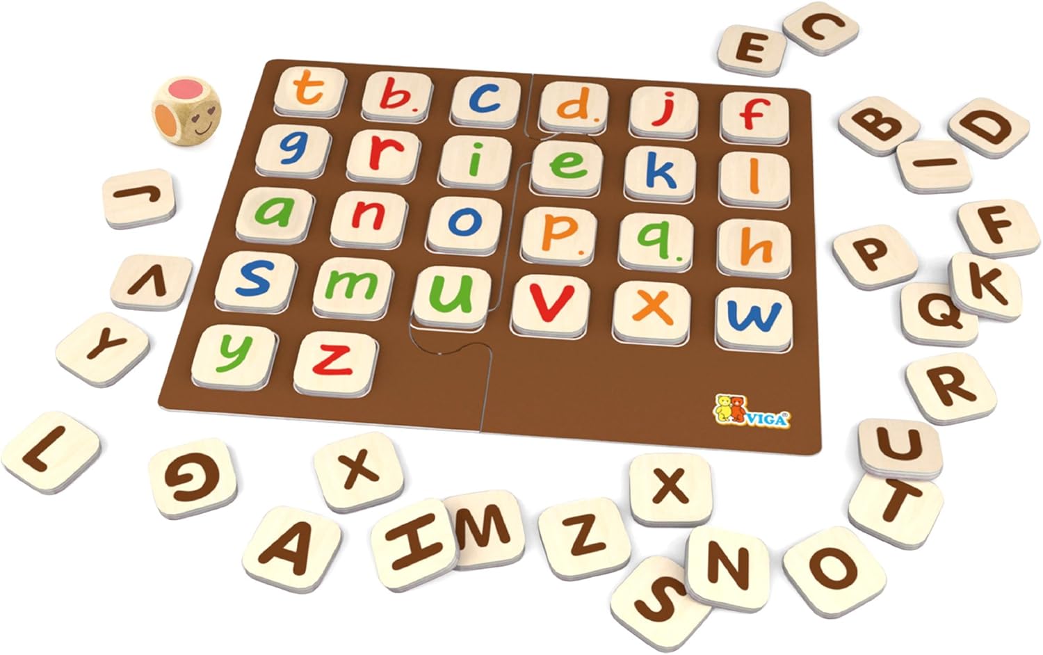 Learn the alphabet easily with this 2in1 game. A matching and memory game containing 26 uppercase and 26 lowercase letters, 1 big dice and 1 brown cardboard base. Game guide included.