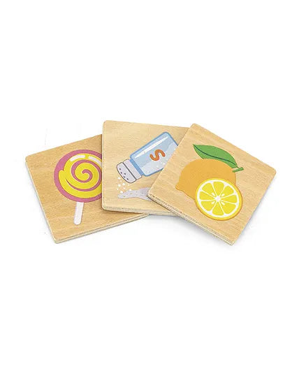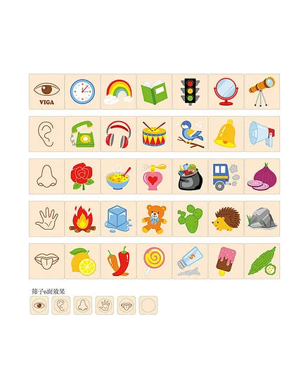 The Learning Senses Puzzle set has 35 wooden pieces painted with non-toxic inks for great educational activities. puzzle pieces mixed of fruits, vegetables, animals, food, insects, sports, vehicles and etc. Place them on what the dice is showing after being rolled