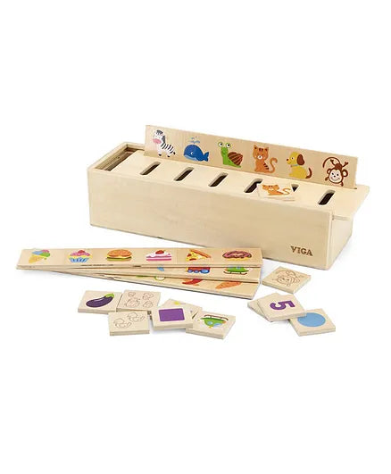 The Wooden Educational Sorter from the renowned VIGA brand is the perfect toy for children who are starting to explore the world. Nice, made of high-quality wood, the box has 6 compartments on a removable lid, into which you can throw wooden blocks with the appropriate category. The set includes 4 long boards and 48 pieces of wooden blocks with the categories of vegetables, fruit, transport, shapes, animals and numbers. Place one of the boards on the lid and then find the matching picture to put it in the appropriate compartment. Thanks to this game, your child will learn basic materials from everyday life and learn to categorize.