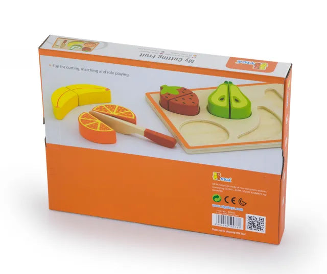 Fun for cutting, matching and role playing. This all in one set includes a Strawberry, Pear, Orange, Banana, wooden knife and a cutting tray with cut out matching shapes for great role play adventure for the young chef.