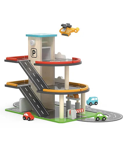 This wooden toy is a three-level parking garage including gas station, car washing station and elevator, together with 3 cars of different colors and 1 helicopter. Not only can you drive the toy cars from floor to floor using the road ramps, you can also put them in the elevator and lift them up and down.
