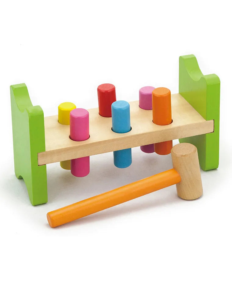 Pound the colorful wooden pegs into the wooden frame, then flip it over to repeat it again and again!