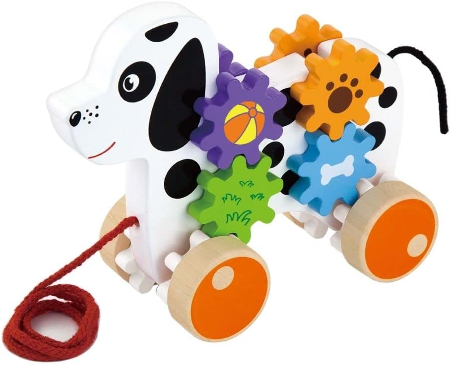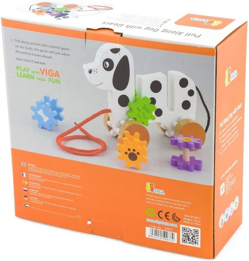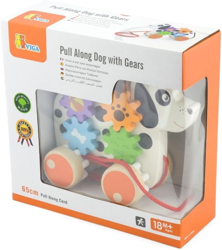 Beautifully crafted wooden pull along dog with colorful gears that turn as he moves along. The wooden gears can be removed from the slots and put back in a different arrangement. Young children will love taking their toy dogs for a walk and watching the gears spin.