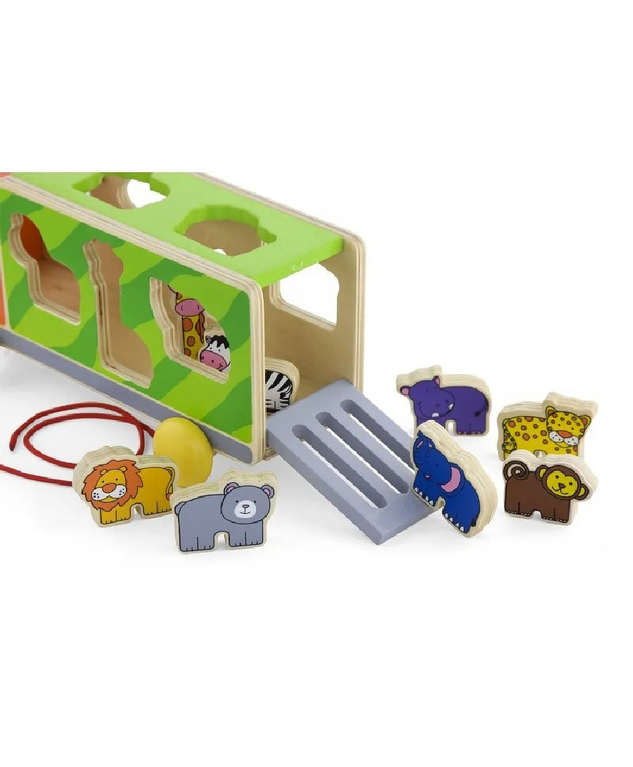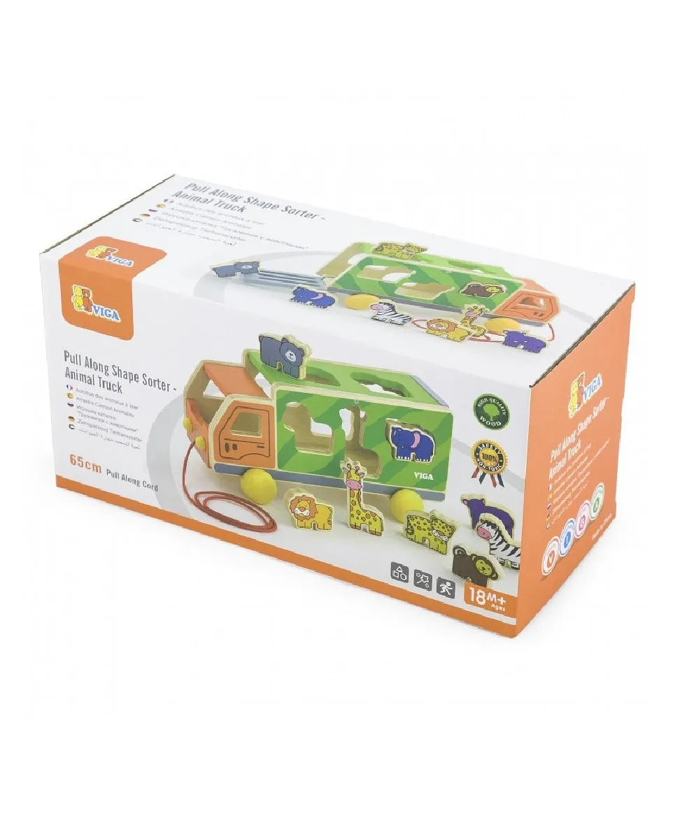 Wooden pull along shape sorting truck. Toddlers can fit various wooden shapes through the matched holes, then open the lid & take them out to start again. This toy is for learning the basic shapes & numbers.
