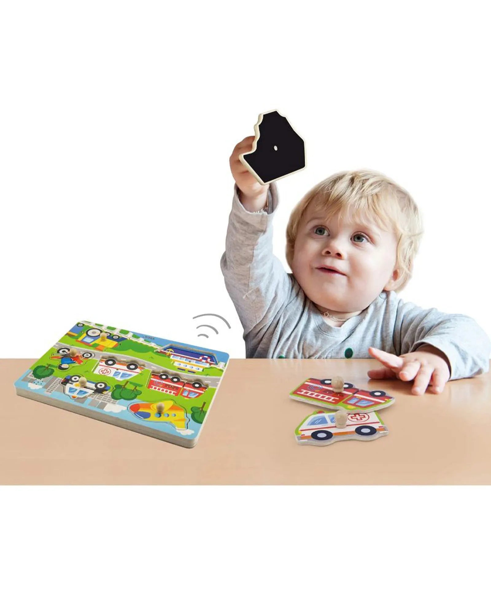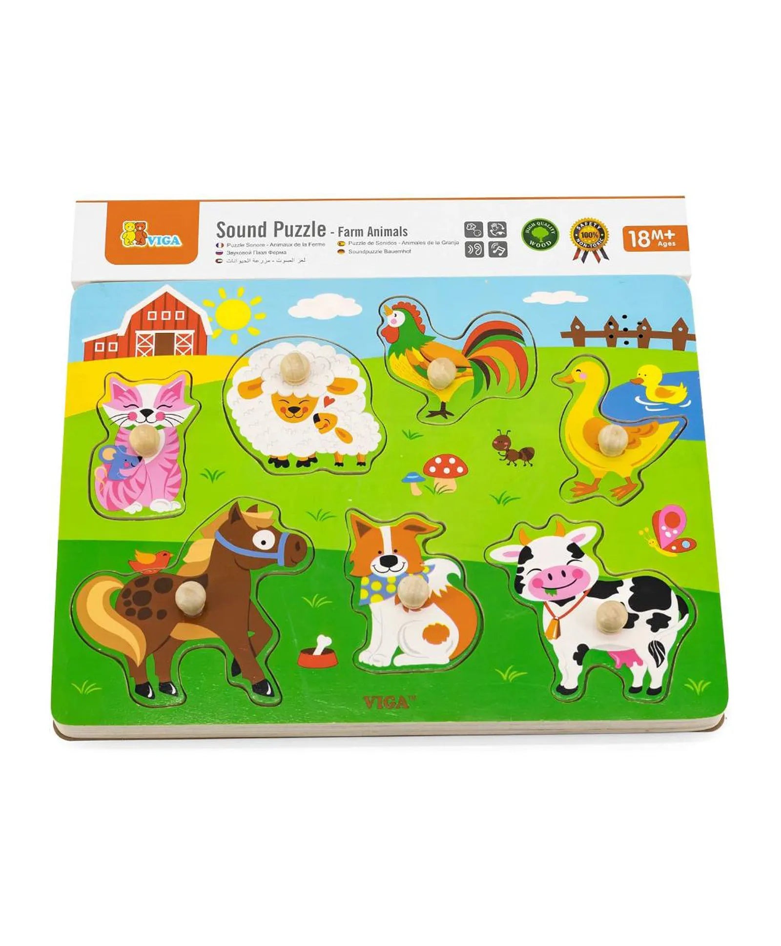 Farm animals/transportation tools puzzle brings big surprise.- Lift the animal/transportation tool pieces up, and put it back, you will hear the sound of this animal/transportation tool. Learn about farm animals/transportation tools, improve matching skills and ability of hand-eye coordination with great fun. Same patterns underneath for easy matching.