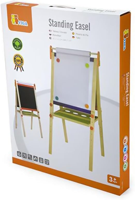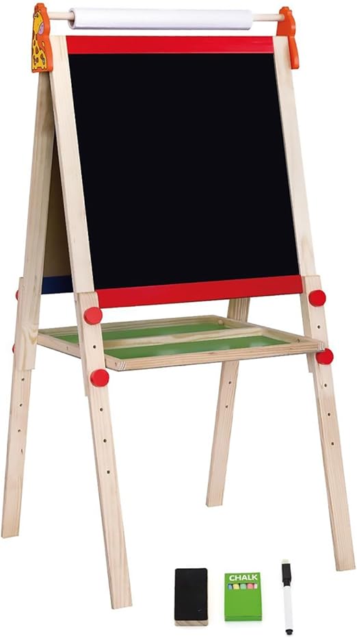 This colorful standing easel with a blackboard and a magnetic white board and includes a box of chalk, an eraser and a marker pen.- The printed 26 alphabet letters work as a guide for children to write letters on the board. It also includes a small wooden abacus and a clock with movable hands.