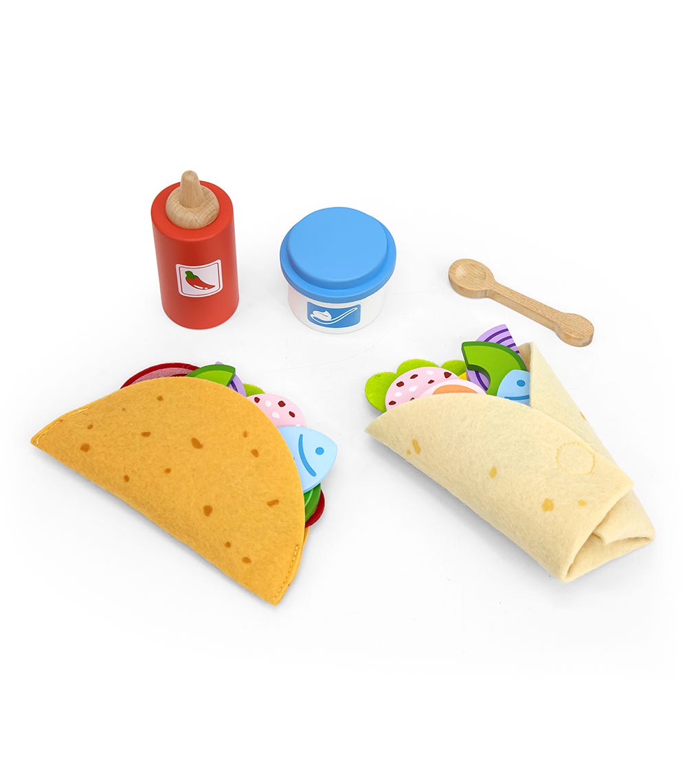Create flavourful imaginary meals with the Viga Taco Set. Designed to spark imagination and engage young minds, this set invites children to craft their own delicious- looking tacos, complete with a variety of colourful and realistic ingredients. The set includes felt taco shells, wooden vegetables like tomatoes, purple onions, cucumbers, and avocados, along with other ingredients. The tactile nature of the set enhances sensory play as children engage with different textures and shapes, stimulating their senses in a playful and educational manner.