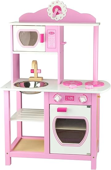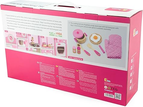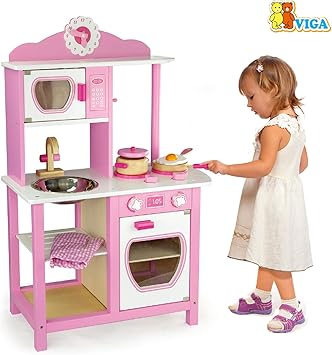 Kids will love cooking up their imaginations with all of the traits in this play kitchen! Play kitchens help to teach children many valuable things. It helps a child grow. In addition to allowing kids to take advantage of their imaginations, play kitchens help them enlarge their social skills. By using diverse play kitchen accessories, kids can also deepen their math skills, learn how to recognize fruits, vegetables, and other foods, and even expand organizational skills. The kitchen is made of wood so that it will serve for many years. The elements are painted in shades of pink and white and will delight every little girl. Kitchen set includes stove, sink, oven and cupboard. Natural, Safe, Educational and Fun are the label of VIGA toys. Play with Viga toys helping your child to develop logical thinking and motor skill. Have a lot of joy with fun.The paints and inks on Viga toys are non-toxic, safety for child.