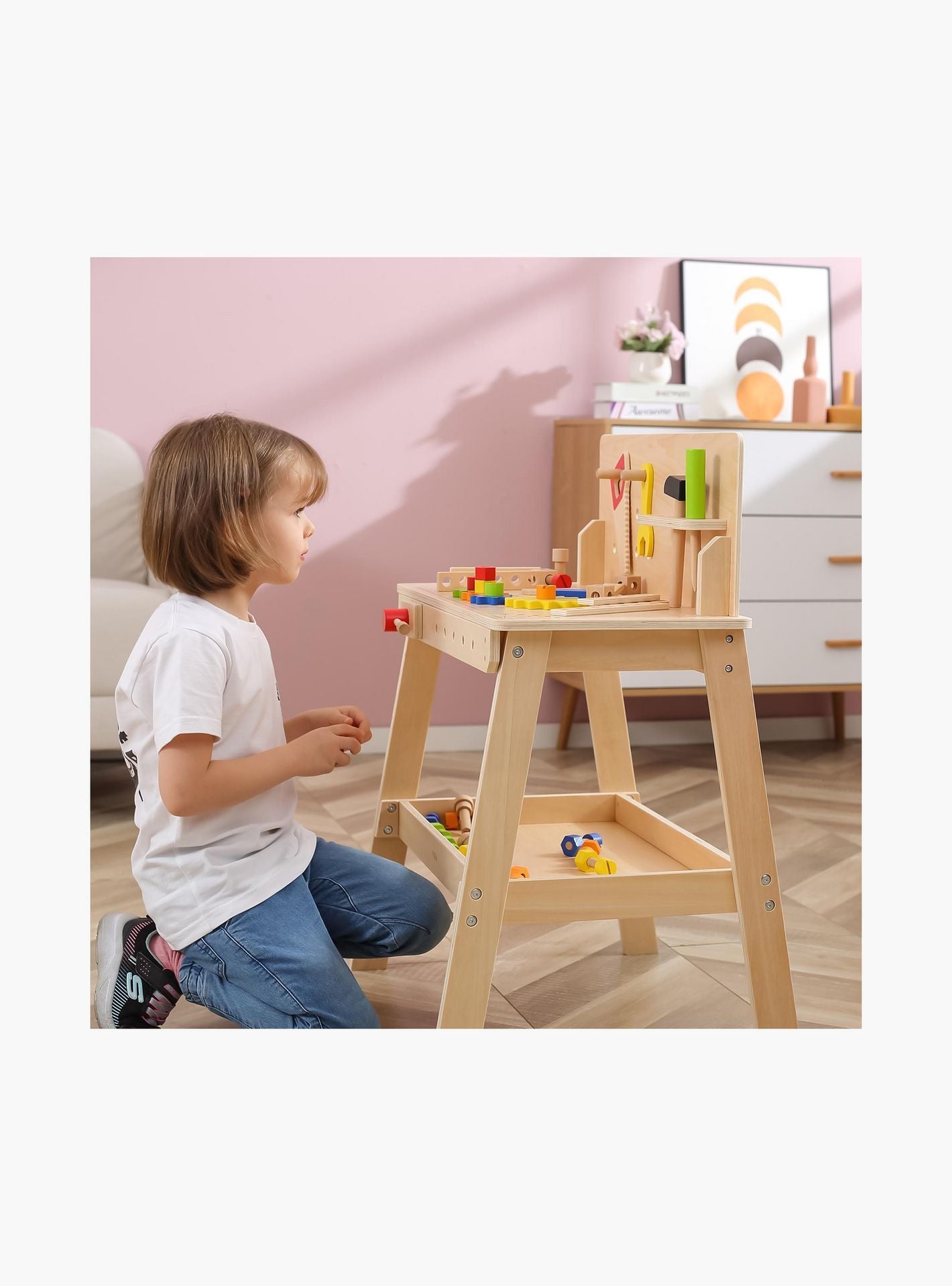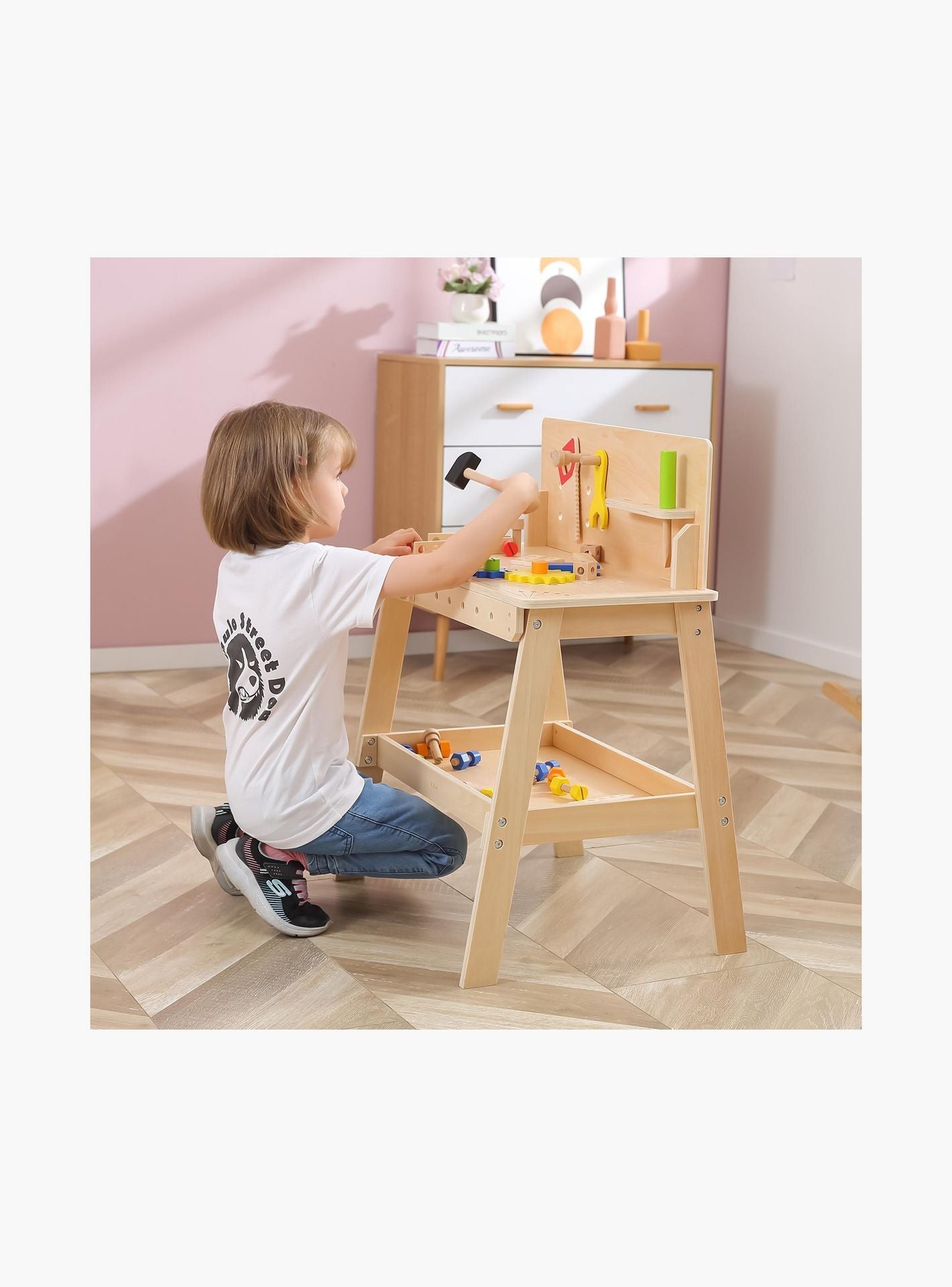 A dedicated storage area keeps all components organized and within reach, while specially designed slots hold tools upright with wooden tools and accessories painted in non-toxic hues and free from sharp edges. Encourage your child's early development through engaging play with this dynamic and skill-enhancing wooden work desk stand.