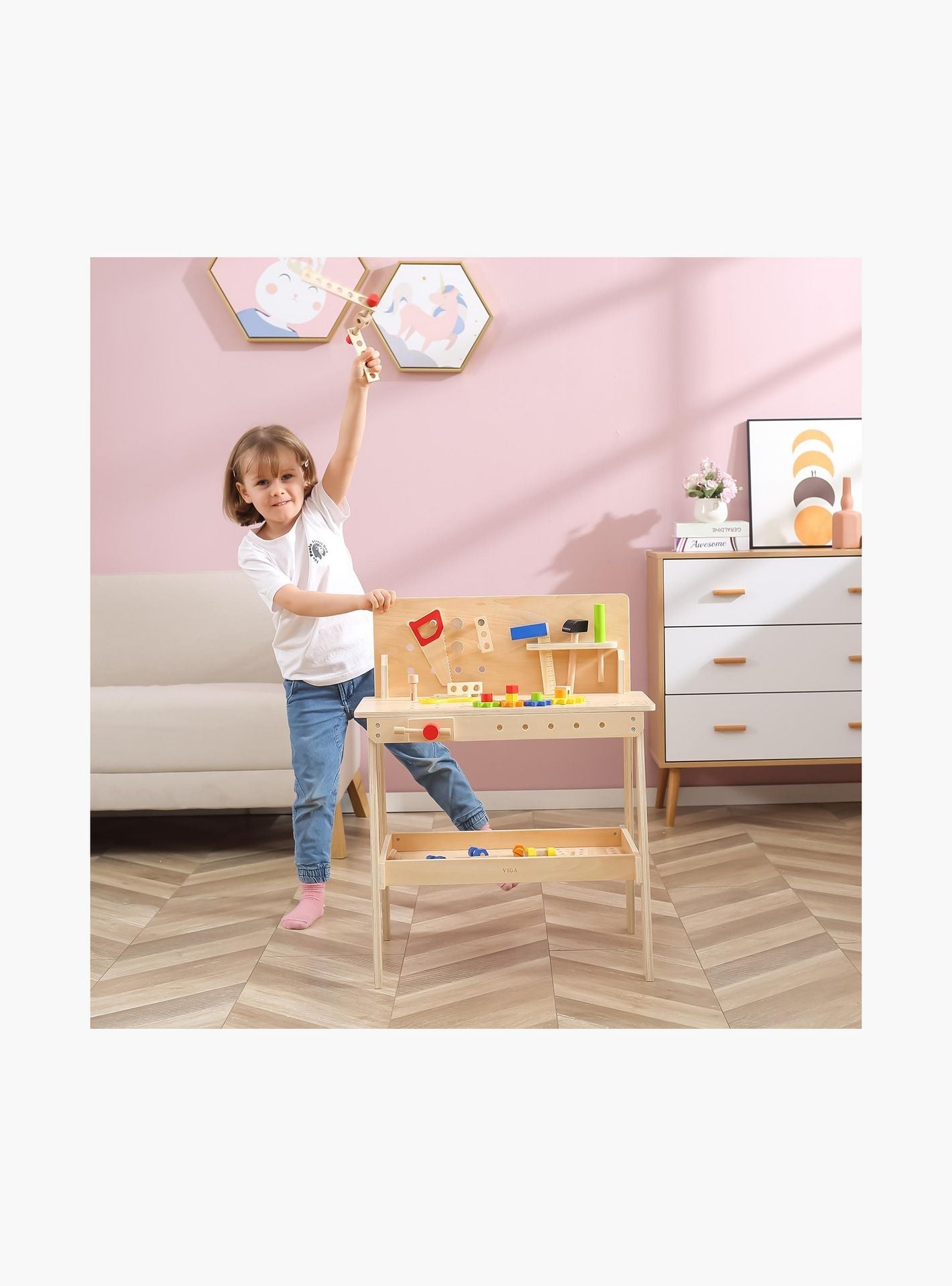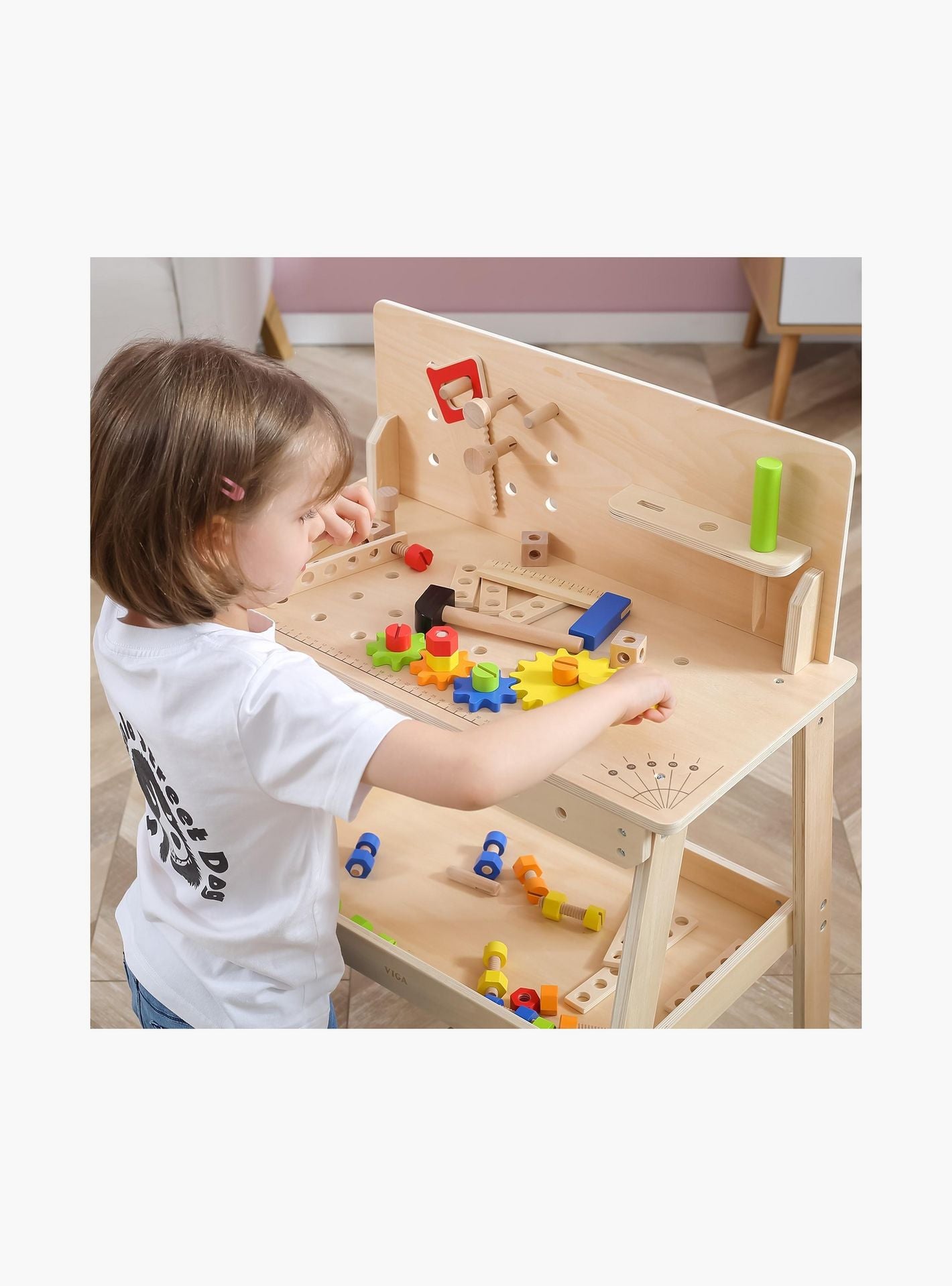 Unleash your child's creativity with the Viga Wooden Work Desk Stand. This captivating educational role-play desk fosters kids' social and motor skills while nurturing their imaginative thinking and problem-solving abilities. Crafted from wood, it comes complete with a hammer, ruler, screwdriver, wrench, and an assortment of screws, nuts, bolts, gears, and more. The desk's surface boasts an array of holes that invite exploration through hands-on activities like screwing and assembling.