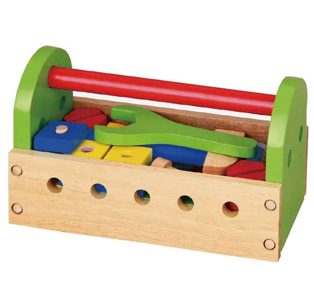 This tool kit contains the main tools plus bolts and nuts, panels with holes and pins in 4 basic colors. children can learn about different tools and develop skills of turning, hitting and matching by playing with this toy.