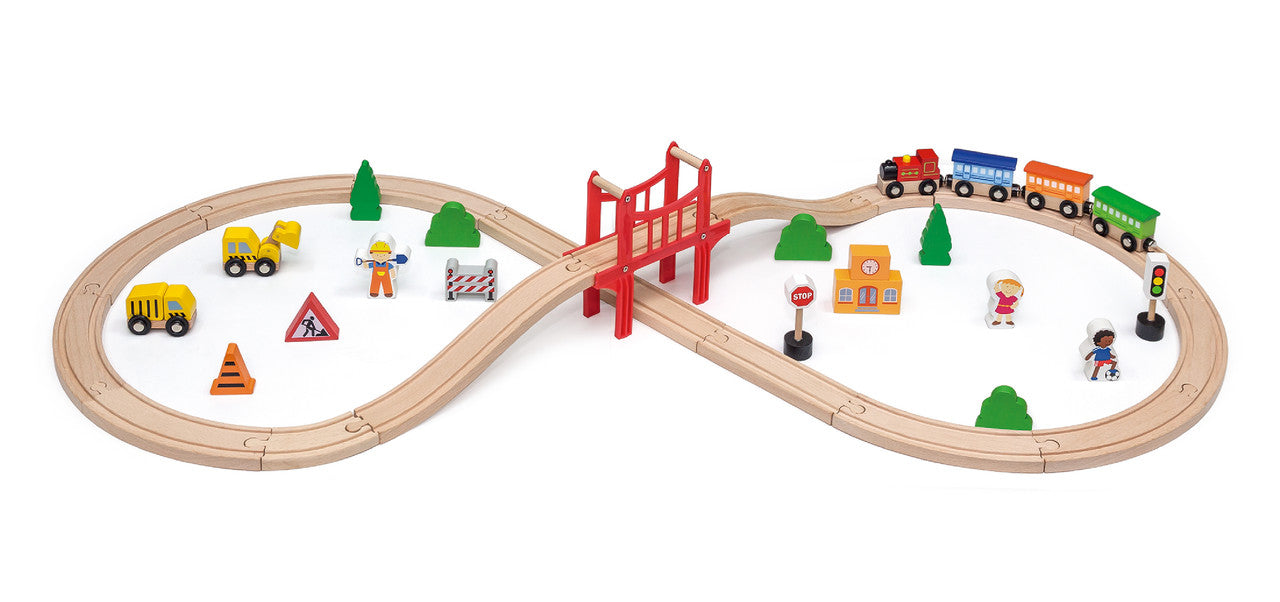 This is a 39 pieces wooden train set, which contains 18 wooden tracks and 21 accessories( includes trees, a bridge in red, hwnan, a train, a truck, an excavator and some warning signs). Children can play it with their friends to enhance imagination and creativity ability and enhance their motor skills.