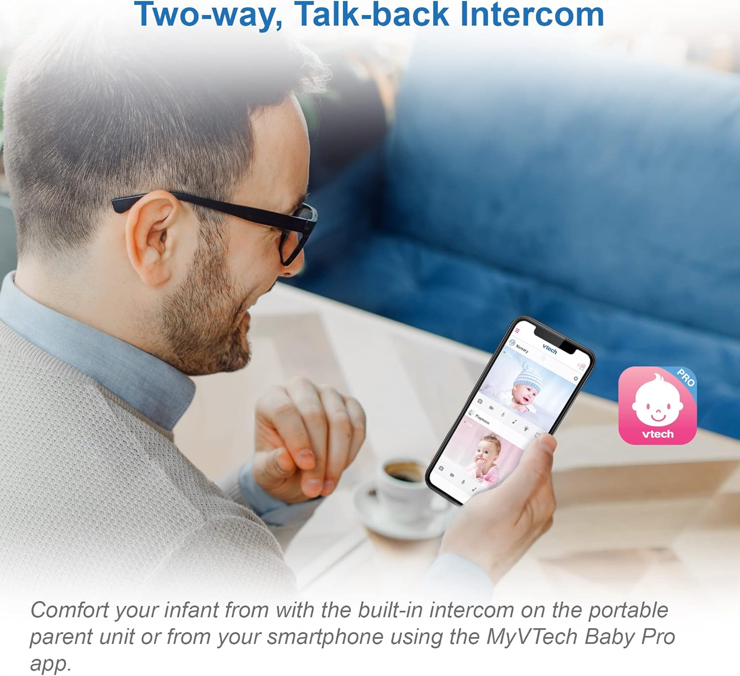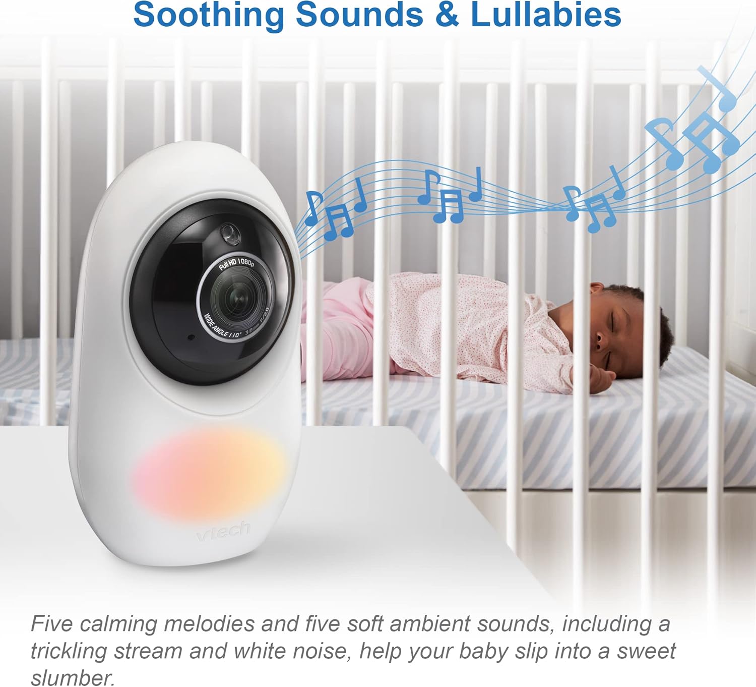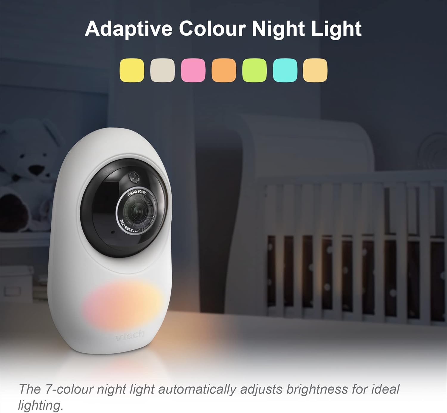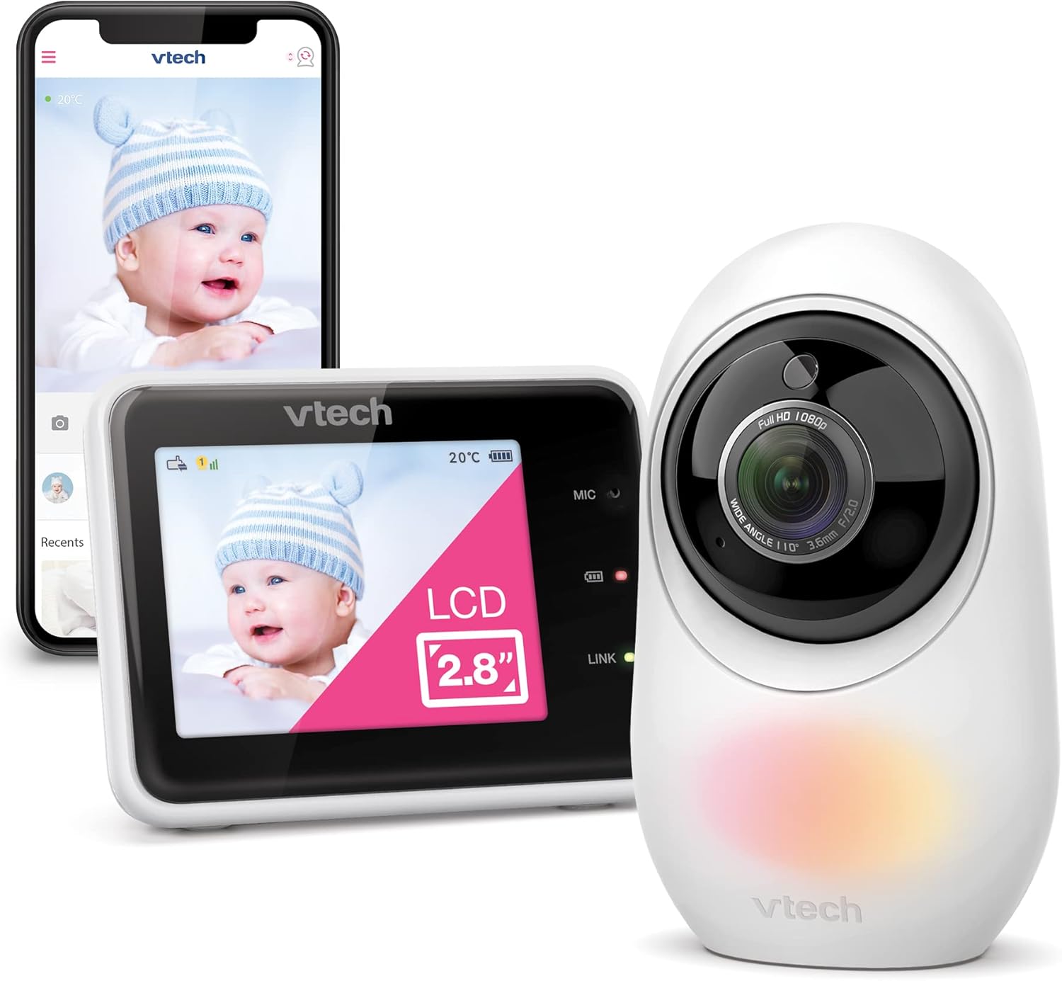 The VTech RM5756HD Smart Wi-Fi 1080p HD Video Monitor with remote access allows you to stay close to your baby when you are at home, on the move or away. This monitor features both Direct Wi-Fi mode - for direct connection between parent unit and baby unit without the need for a separate Wi-Fi network, and Router mode - which uses your home wireless network to stream live video and audio from the HD camera unit to the free MyVTech Baby app. It allows you to maintain a constant connection to your baby. It uses the MyVTech Baby app to let you instantly see and hear what's happening with your baby from anywhere in the world from your smartphone or tablet. It has a 5-inch colour parent unit with a 1080p HD camera with automatic night vision, night light, 24x local digital zoom and 30x remote digital zoom. Two-way talk with the camera from the parent unit or remotely via the app. Comes with 10 soothing sounds, temperature sensor, motion detection, sound activation mode.