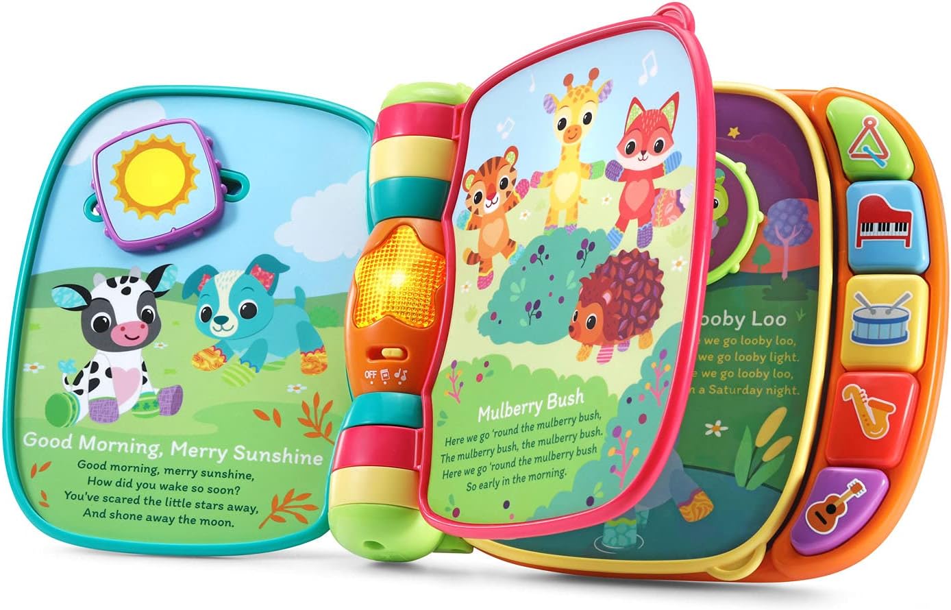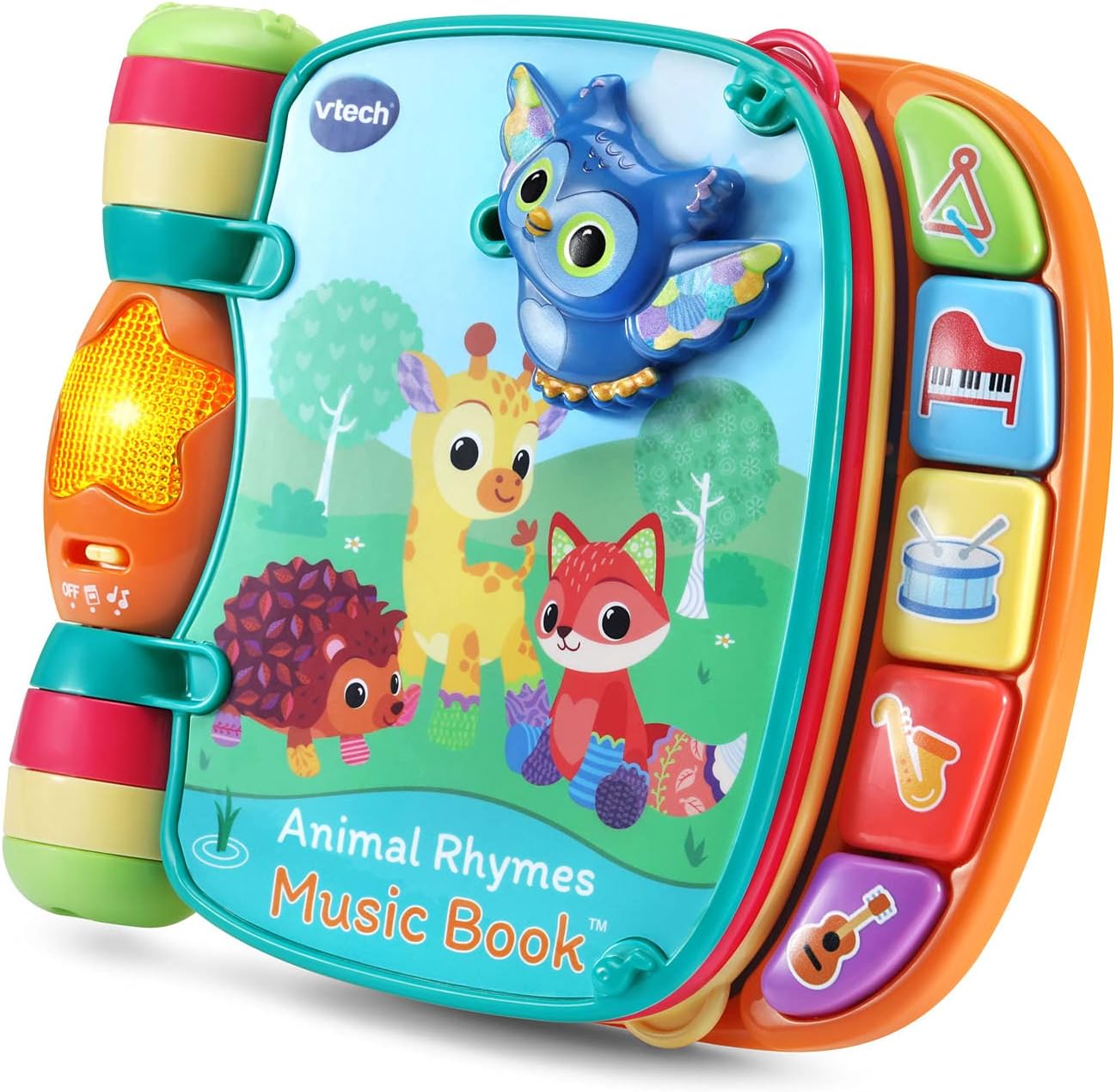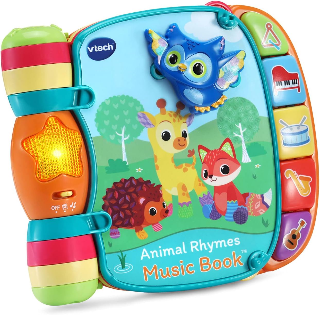 The Animal Rhymes Music Book™ has so many twists, turns (and slides) that little ones will have a hard time putting it down! Easy-to-turn pages are beautifully illustrated with cute, colorful animals and include interactive play features that kids can move to keep them engaged and entertained. Each page plays a familiar nursery rhyme set to music so everyone can sing along. The flashing star twinkles along with the sounds. Encourage your child to press the colorful instrument buttons to add guitar, triangle, piano, drum and saxophone