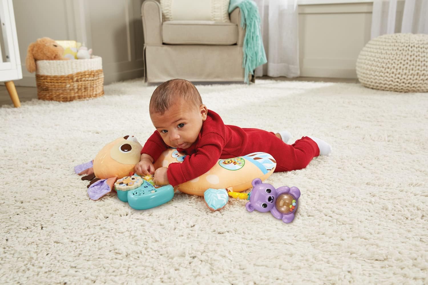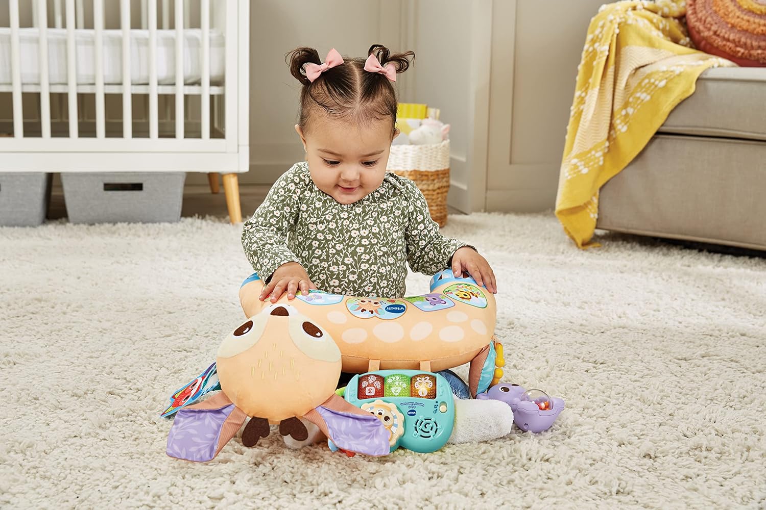 Introducing the 4-in-1 Tummy Time Fawn by VTech! This soft, cuddly tummy time pillow includes 4 ways to play. Includes 15 exciting melodies and 4 fun sing-along songs. As your little one grows the fawn will provide and support tummy time, sitting, take along and on the go play. Soft textures support and encourage tactile awareness. As your little one grows and develops the detachable hippo rattle, self-discovery fox mirror and electronic piano keep little ones engaged.