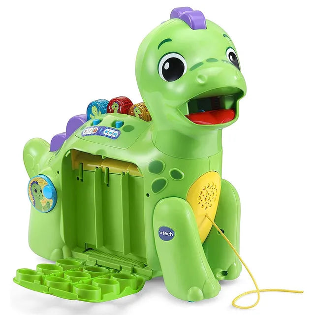 VTech Chomp-along Dino I’ve got the munchies! Feed me tasty treats to learn the first words! Introduces Numbers 1-9 Feed Dino 9 colorful food pieces and listen as he eats them! He will introduce numbers 1-9, colors, and healthy foods such as raspberries and mushrooms. Chunky buttons on his back introduce feelings: you will learn if he’s full of energy, hungry or tired.3 Modes to Explore Dino LOVES to eat so be sure to take him for a walk so he builds up an appetite for more food. 3 exciting modes explore number, color and food learning. Spin the spinner to build fine motor skills, and activate songs and sound effects!