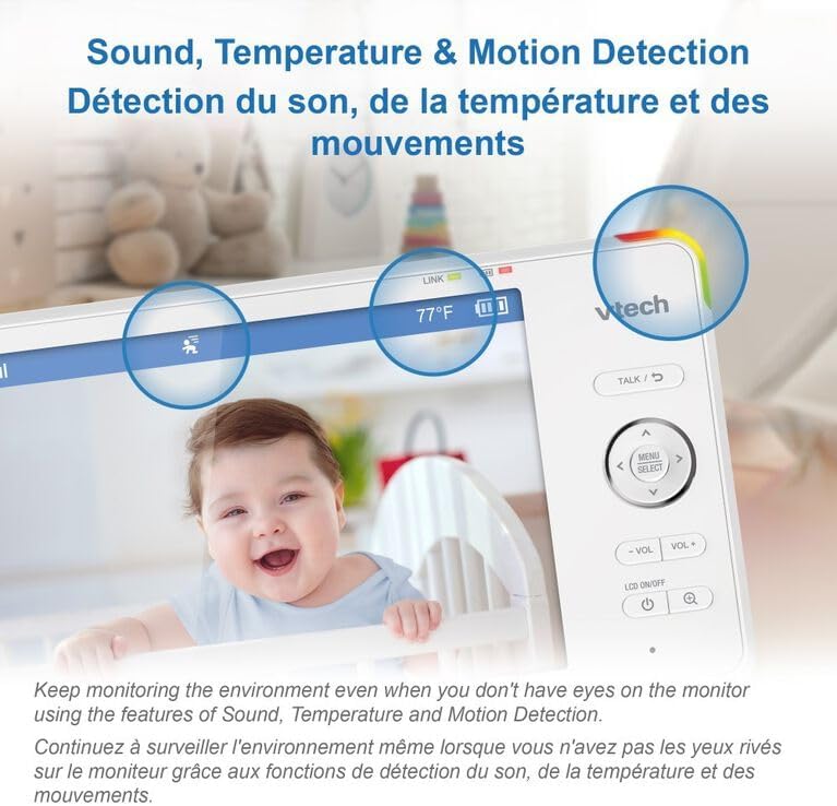 Watch over your little one at home on the 5-inch, 720p High-Definition LCD Parent Unit Display or remotely on your smartphone with the VTech RM5766HD Smart WiFi video baby monitor. View rooms from top to bottom with the 100-degree vertical tilt angle and from side to side with the 360-degree horizontal pan capability. Enhance your baby’s sleep environment with a sound & light profile recommended by the experts at WeeSleep™. Magnify details with the industry’s best 30x times zoom on the mobile app or 24 times on the viewerup to eight times and monitor room temperature and humidity levels directly from the Parent Unit Display. Plus, see your baby as clear as day, even in ultralow light, thanks to the automatic infrared Night Vision. Free professional in-app advice and videos provided by the experts at WeeSleep™ that help assist in sleep and the growth and development of your baby.