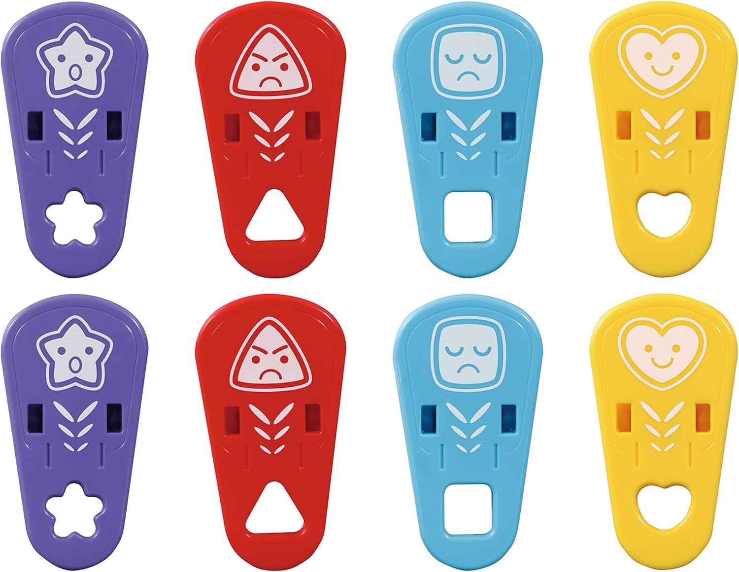 - Features 8 light up shape buttons and 8 emotion pegs that give different reactions when the pegs are on or off
