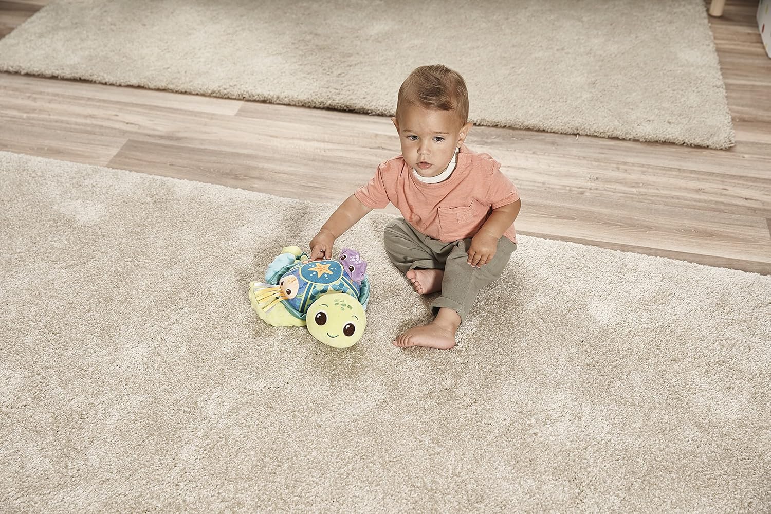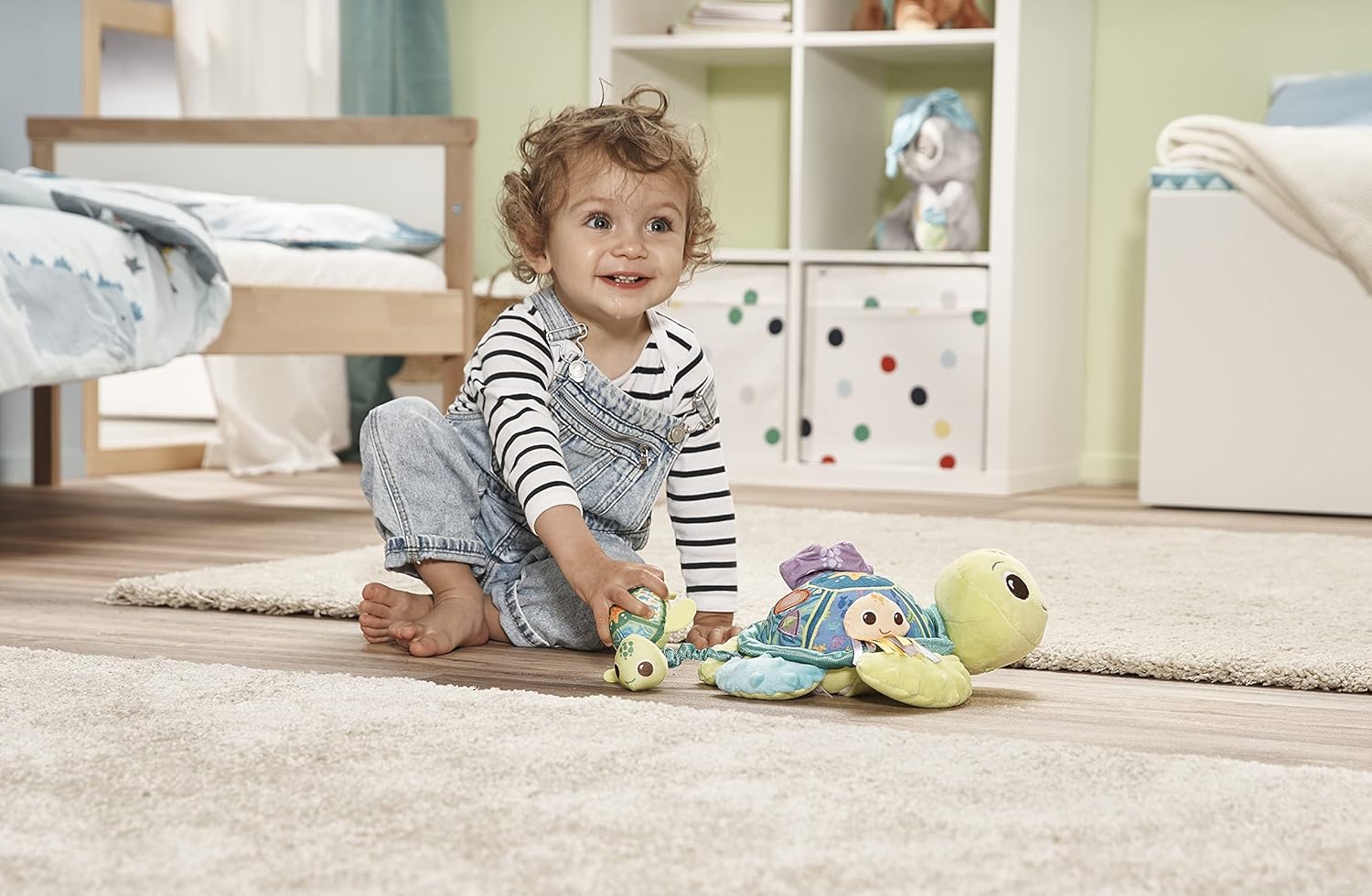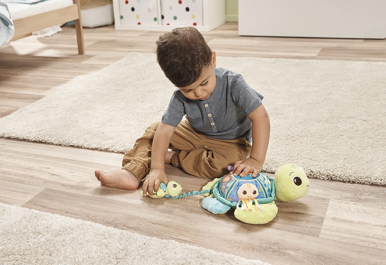 Pull baby turtle out and watch it wiggle back to big turtle! Press the soft fabric buttons for early learning content, sounds and melodies. Peekaboo mirror and ribbons for self-discovery and tactile stimulation.