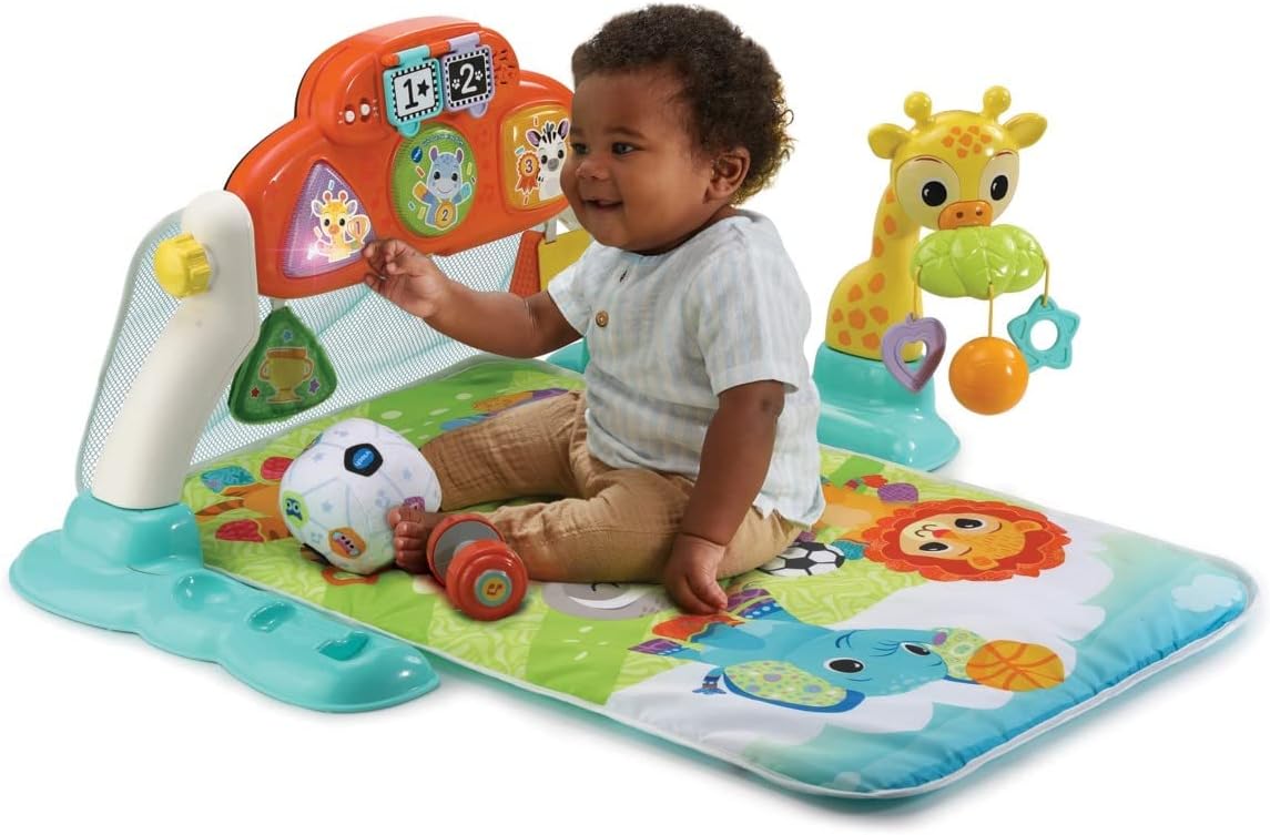 Kick up those little feet and get active with the Kick & Score Play Gym! Watch your baby achieve motor-skill milestones with this multi-stage play mat and accessories. Start with lay-down play, kicking at the ball and patting at the giraffe mobile with dangling shapes. Ready for tummy time? Enjoy the colourful characters and the dumbbell rattle, twist and click kettle bell, red & yellow cards and more while helping your little one strengthen core muscles. Interactive learning panel teaches colours, shapes & animals and reinforces language skills. Take the detachable panel along for on-the-go play and exploration. Remove the fabric football and give your toddler an extra goal-scoring challenge!