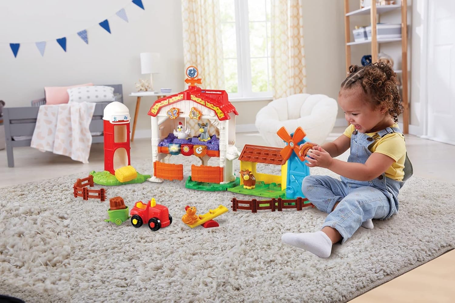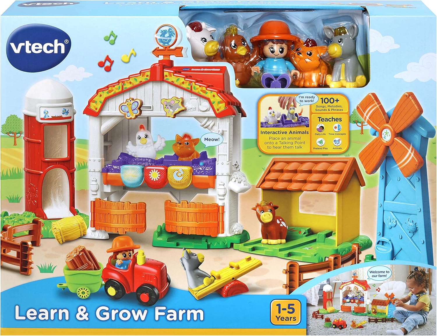 VTech Baby Learn & Grow Farm. This super cute farm play set is all about discovering, playing and exploring Teaches times of the day. , , Featuring a moveable play panel that gives different responses depending on whether it's in or out of the farm building 3 chunky, light up buttons teach times of the day; morning, afternoon & evening with fun character related phrases about what the animals do around the farm at those times , , Two modes of play. Place the farmer & animals on the Talking Point to hear them introduce themselves with fun facts through the two modes of play; Playtime and Farm time. Includes 3 sing-along songs and 12 fun melodies. Encourage language development and imaginative play.