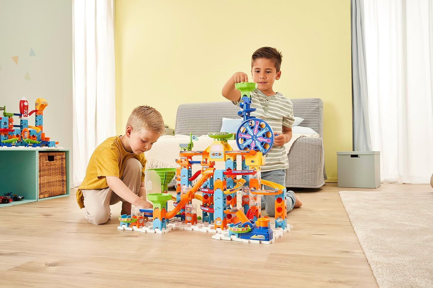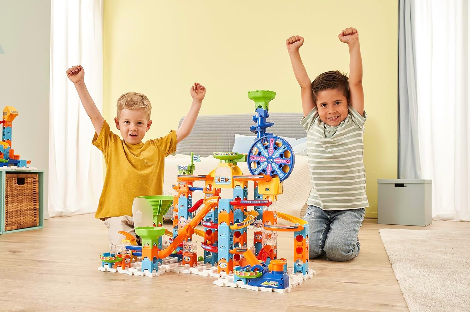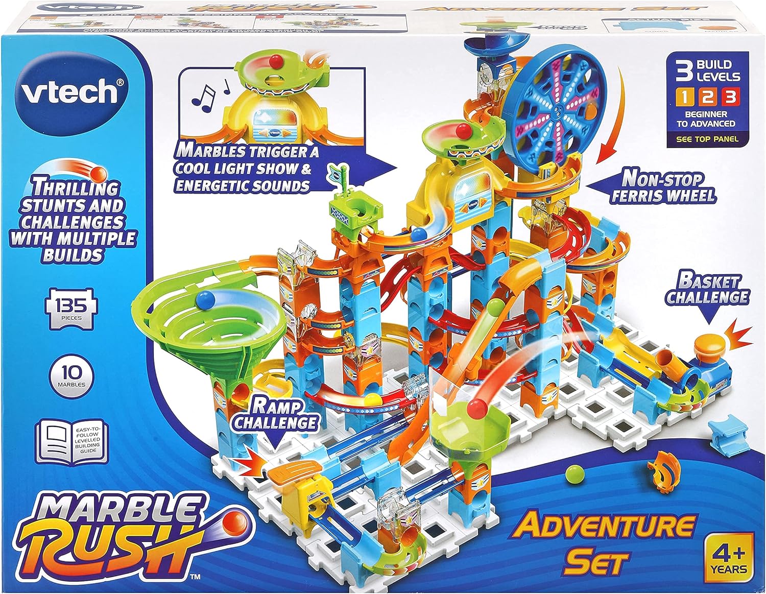 Time for the ultimate project build with the Marble Rush Adventure Set! This exciting colour coded play set features all the pieces you need to create a Marble Rush Adventure full of jumps, stunts and even an electronic Ferris wheel! The 2 electronic modules allow for marble runs to be reset or tracks to be split, all whilst playing cool music and sound effects to enhance the experience! With 10 marbles included and 135 building pieces to assemble, there is plenty of fun to be had! Includes easy to follow assembly instructions! Compatible with other VTech Marble Rush items!
