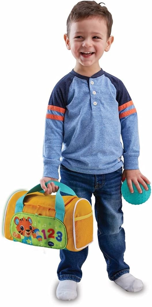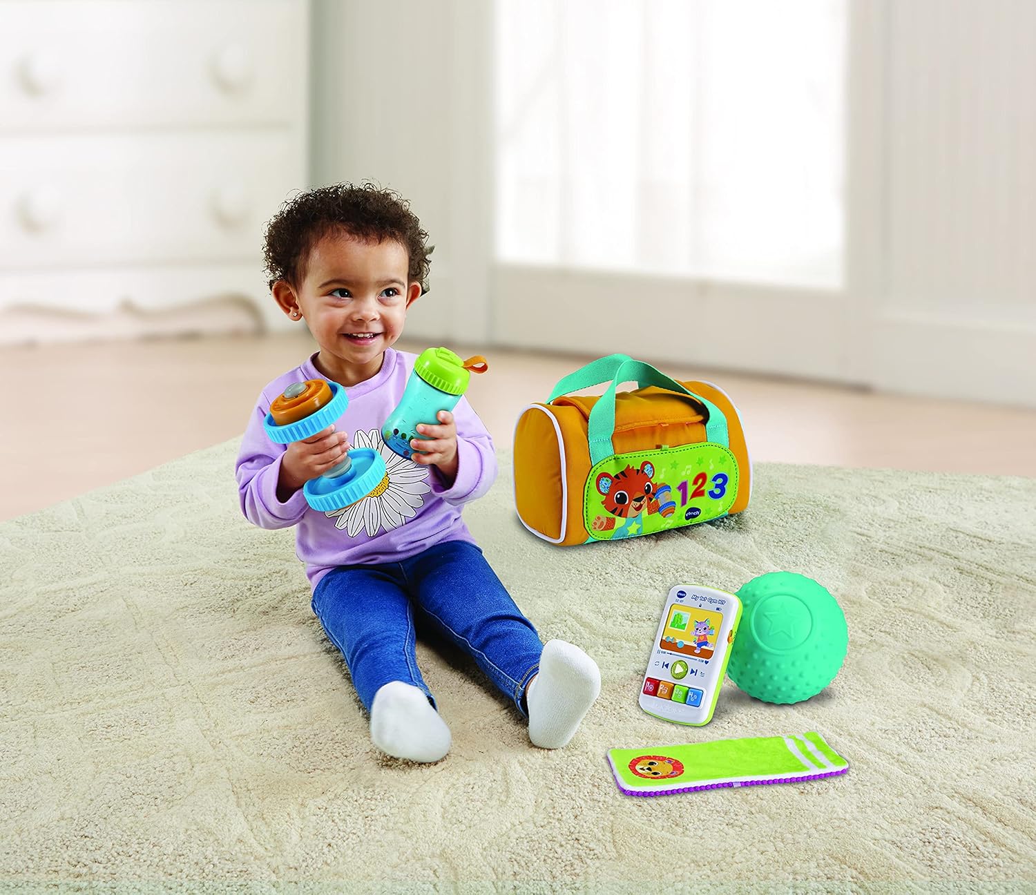 Brightly coloured workout gear includes a dumbbell, textured ball, water bottle rattle, crinkly towel and music player. Press the buttons on the music player and work out to three energising songs, 20 melodies and smart phrases that introduce numbers, objects, colours and more. Put all the accessories inside the fabric gym bag for storage at home or to carry everything on the go. Let's keep moving!