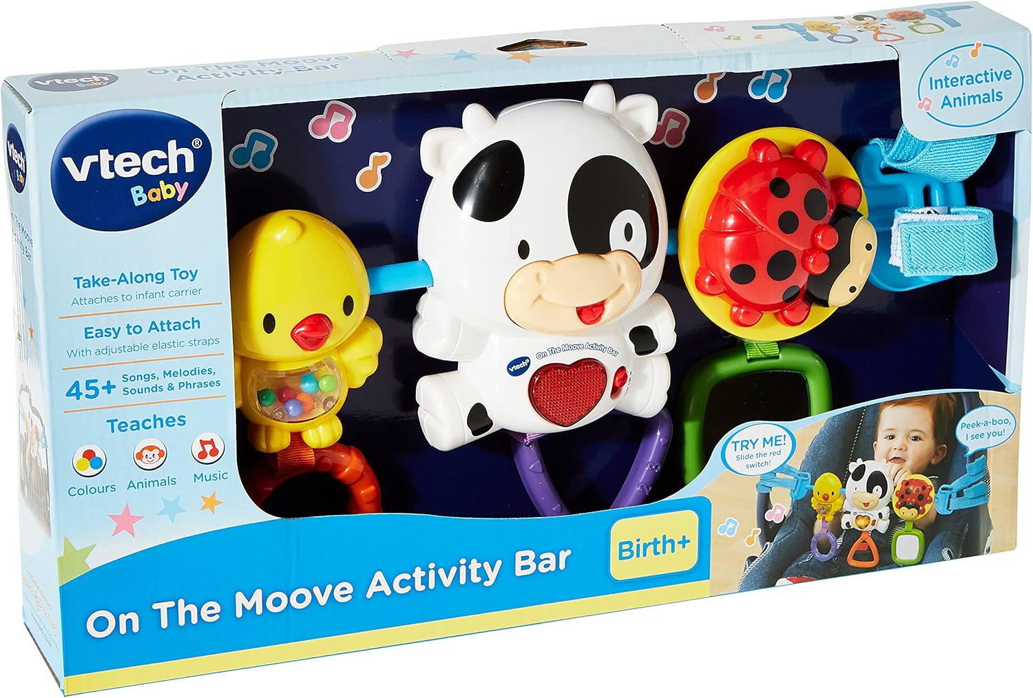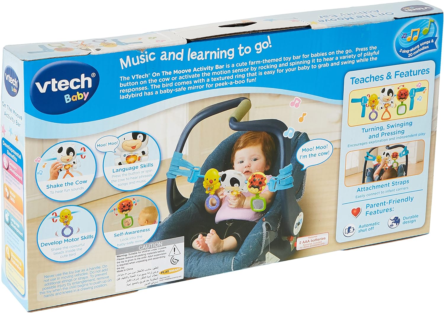 The VTech On-the-Moove Activity Bar is a cute farm-themed toy bar for babies on the go! Press the button on the cow, and be rewarded with cheerful phrases and playful songs and melodies. Swing the cow back and forth to activate the motion sensor and hear interesting sounds. The bird holds a textured ring that's easy to grab, and the ladybug has a baby-safe mirror for peek-a-boo fun! This interactive bar easily attaches to most infant carriers using easy to attach adjustable elastic straps. The baby activity bar is intended for babies from birth to 3 years. The musical toy requires 2 AAA batteries (batteries included for demo purposes only; new batteries recommended for regular use)