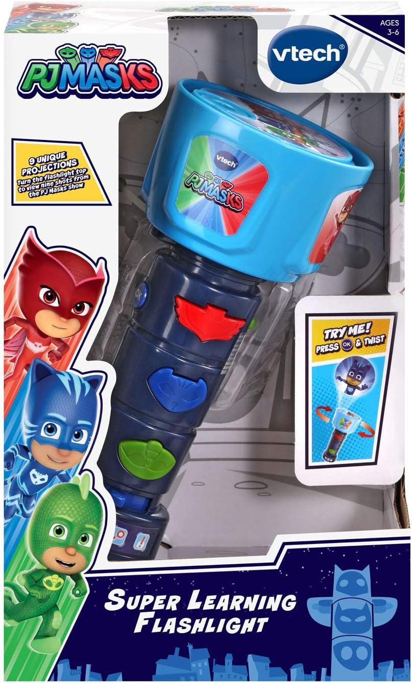 Turn on the PJ Masks Super Learning Flashlight and shine a light on learning! Play games with Super Learning, Discover and Time to Rhyme modes. Answer questions with projected images from the show and hear the real voices of favorite characters Catboy, Gekko and Owlette. Pretend you are solving a PJ Masks mystery while you explore the alphabet, numbers, colors, rhyming and PJ Masks trivia. When the sun goes down, switch to Flashlight mode to find your way in the dark. Day or night, you can be a hero just like PJ Masks! Intended for ages 3-6 years. Requires 2 AAA batteries. Batteries included for demo purposes only. New batteries recommended for regular use. Hear the real PJ Masks character voices of Catboy, Gekko and Owlette along with dynamic sound effects. Explore the alphabet, rhyming, numbers, colors, PJ Masks trivia and more with three learning games: Super Learning, Discover and Time to Rhyme Turn the flashlight top to project nine unique images from the PJ Masks show. Flip to Flashlight mode to be a nighttime PJ Masks hero.