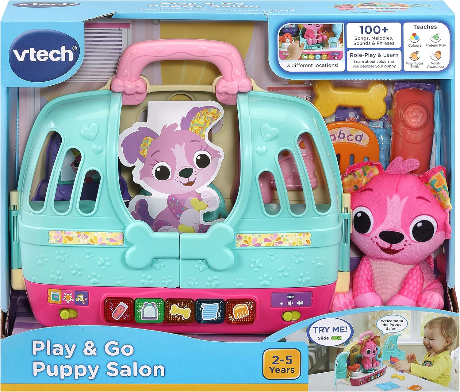 Lights and sound effects enrich playtime as you pretend to wash, comb, dry and clip this soft pup. Learn about colors and puppy grooming as you play! The pet salon features three styling stations. Place the puppy in the swivel seat or use the shampoo, hairdryer and shower to activate songs, lights and phrases. Swivel the seat to go from bathing to grooming to styling stations. Wash the puppy with the pretend shower sprayer, then dry the puppy’s fur with the play hairdryer. Press five light-up buttons to hear words about colours, grooming and more.