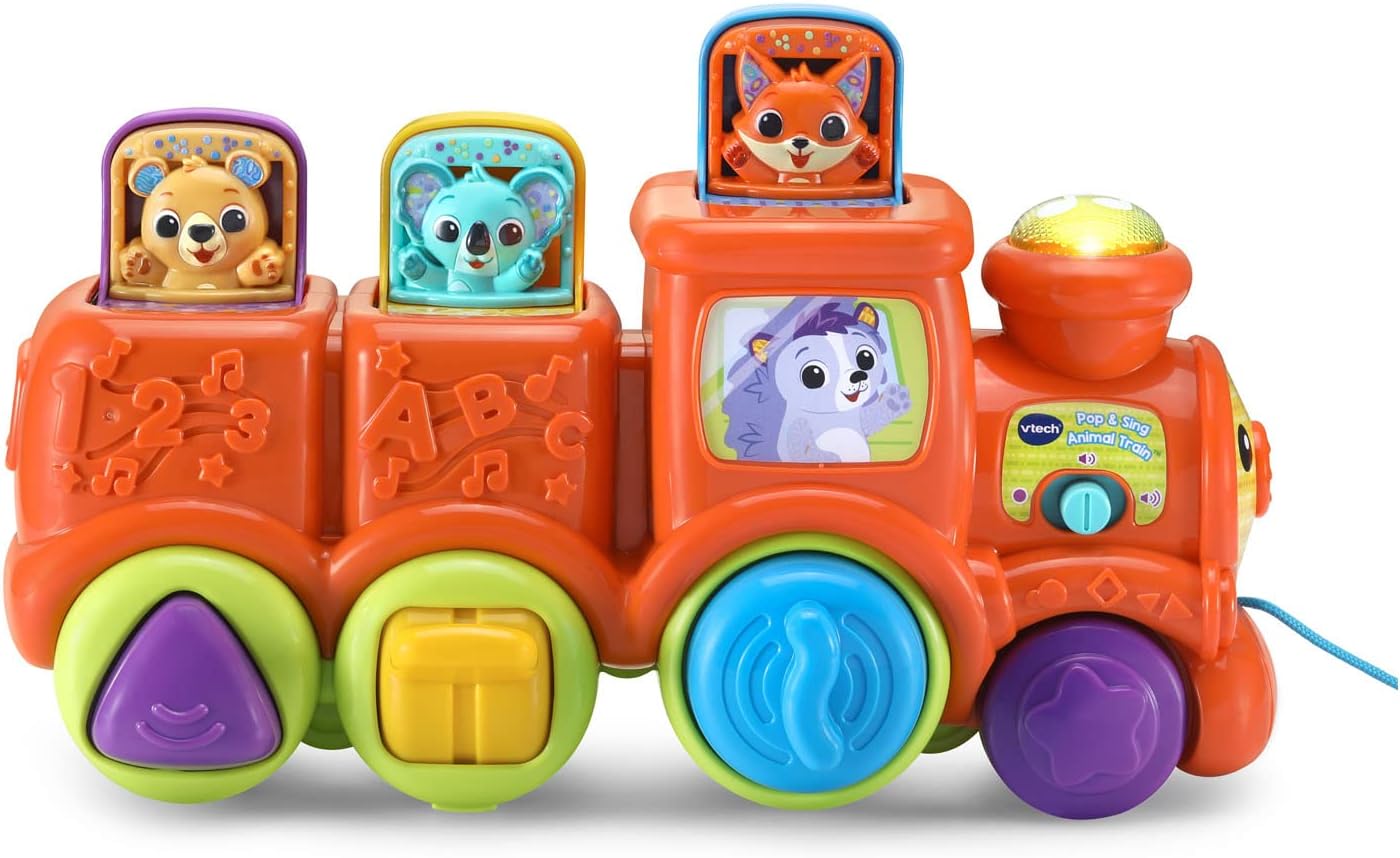 All aboard for pop-up surprises! Join the animal friends on the Pop & Sing Animal Train. Explore the fidget features on the wheels to work little fingers and experiment with cause and effect. Where are the animals hiding? Press, push, flip, and twist to make them pop up. Surprise! Hear fun facts about the bear, koalas, and foxes and where they live. Encourage crawlers to push the train along and see the smokestack flash to the music. When toddlers are ready to walk, they can pull it along to hear sound effects, fun phrases, and songs. It’s time to roll! Choo-choo! Intended for ages 6–36 months. Requires 2 AAA batteries. Batteries are included for demo purposes only. New batteries are recommended for regular use.