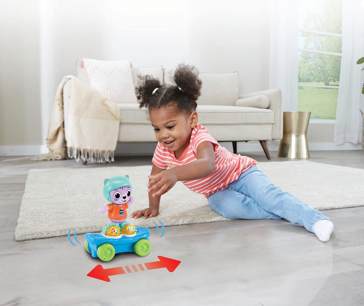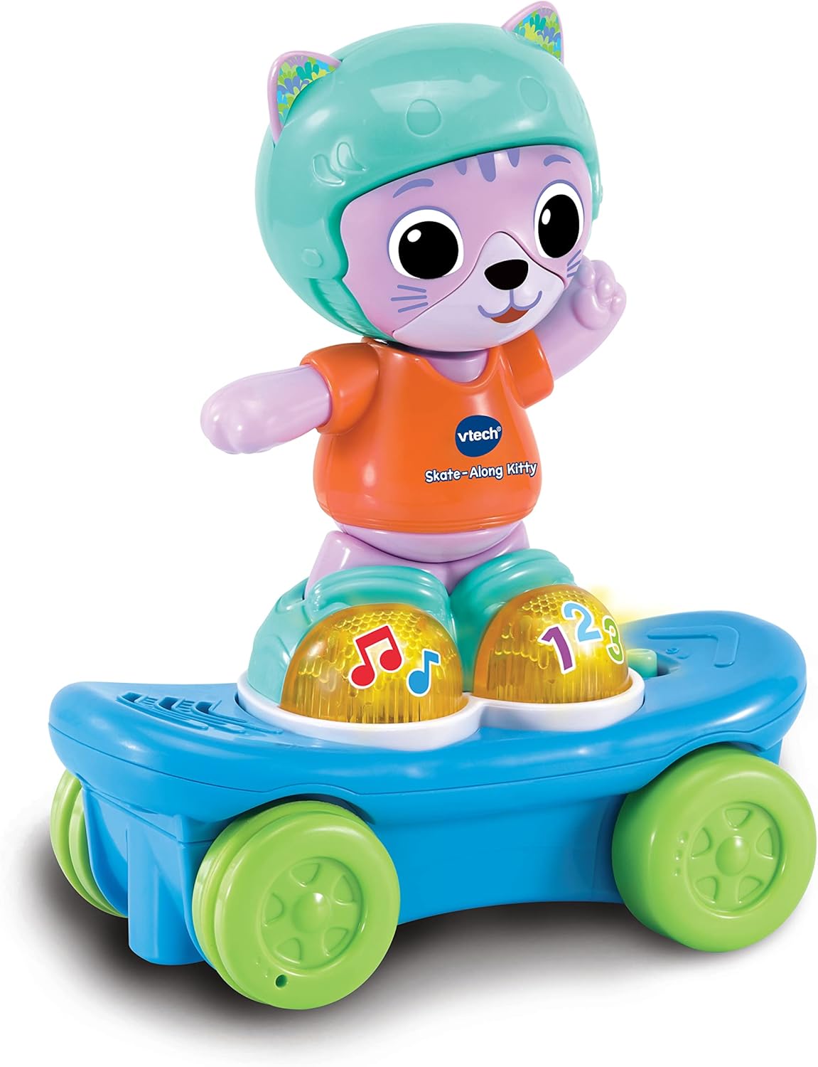 Introducing the Skate-Along Kitty by VTech! This skateboarding kitty is great for getting little ones moving. Pull the skateboard back and release & she will move back and forth rhythmically. Encourages cause and effect relationships and gross motor skills. Featuring 2 light up buttons that introduce letters and numbers & triggers fun phrases and music. . When the motion sensor is triggered, Kitty responds with cool skateboarding phrases, fun melodies and sounds. Encourages cause and effect relationships and gross motor skills. Includes 20 melodies and 2 upbeat sing-along songs.