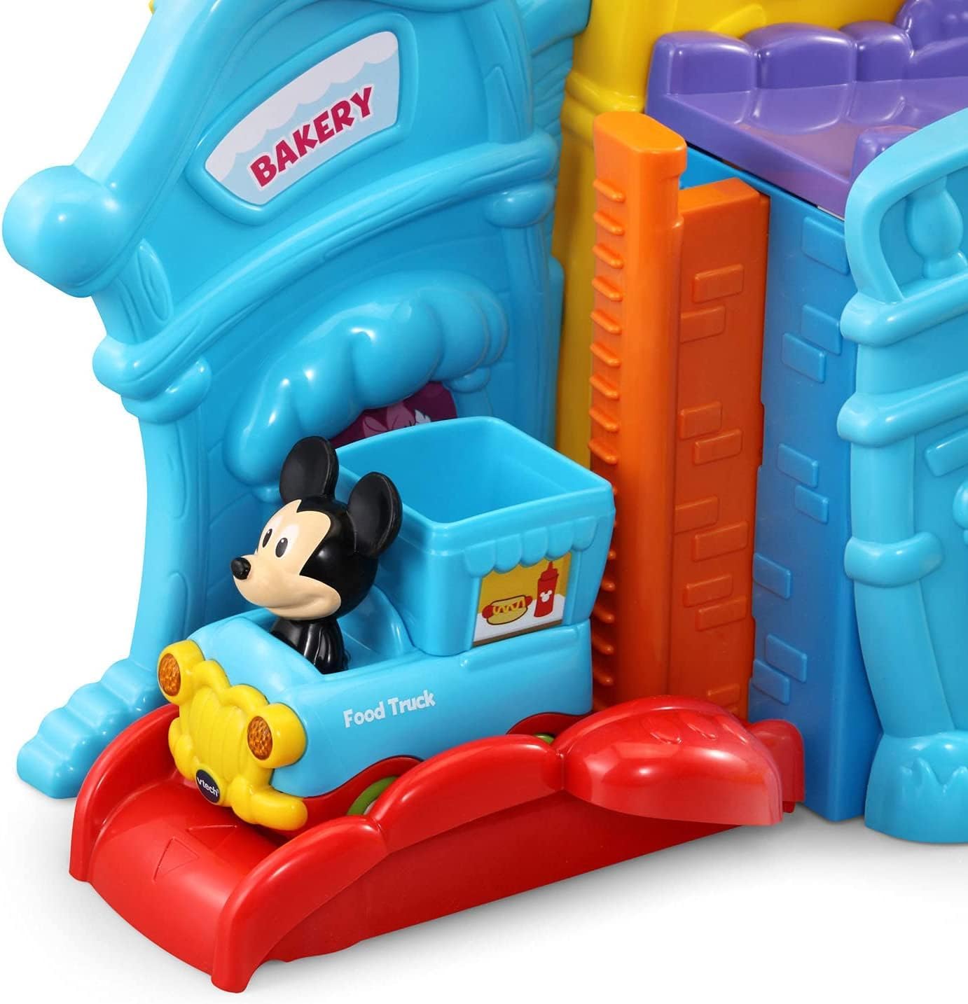 - Move the Mickey Mouse Food Truck around the tracks, open and close the window and door and raise and lower the elevator to build motor skills.