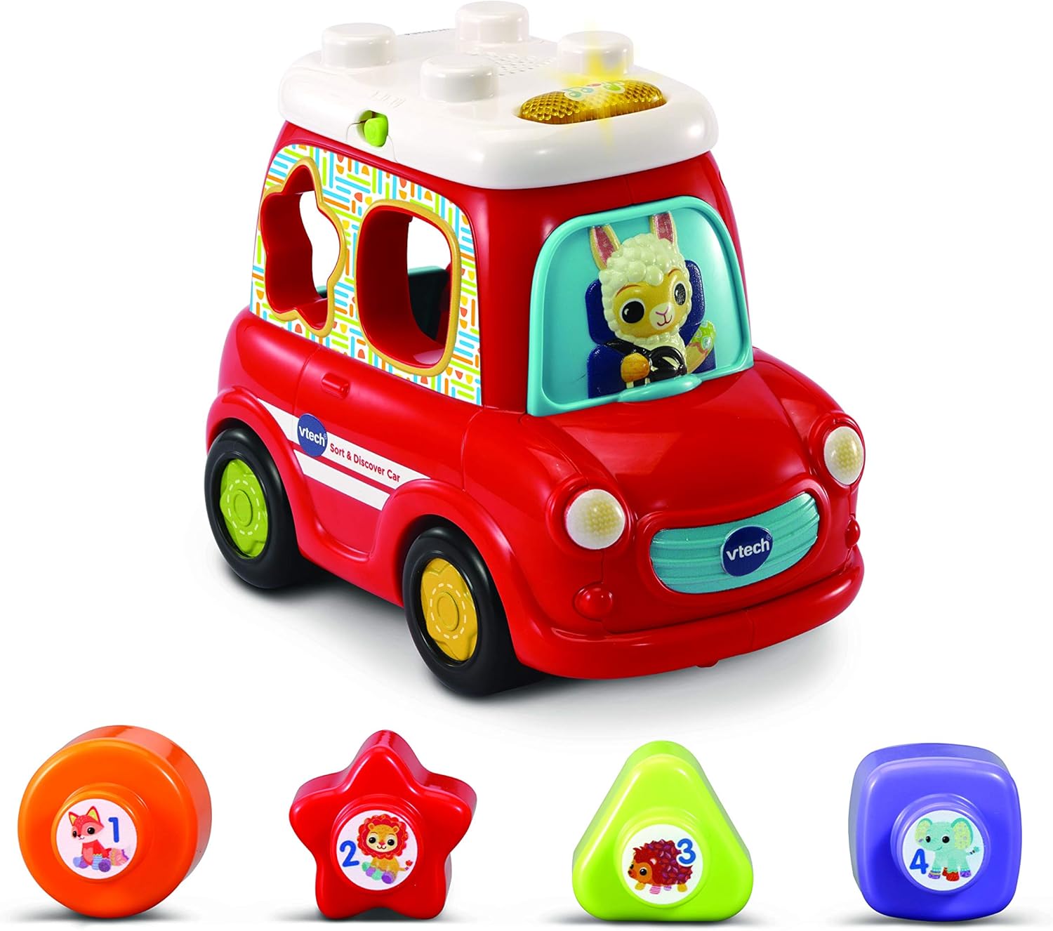Zoom along and sort the shapes with the Sort & Discover Car by VTech! This fun car features shape sorting pieces that trigger responses when inserted correctly. When your little one places the shapes into the car they will hear the name of the shape, numbers & s Press the light up button on the roof to hear fun sing-along songs and melodies Open the boot to remove the shapes for continuous play Stack the shapes on the roof and see how high you can get them Includes 3 sing-along songs and 15 melodies Dimensions: 21.5 x 25.0 x 12.8 cm Weight: 0.794 kg