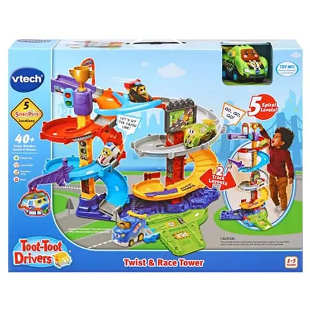 Welcome to the Toot-Toot Drivers Twist & Race Tower from VTech. This cool multi-level, multi-configuration raceway features 3 feet of fun and 5 exciting levels! The 2 configurations; duel ramp and twisting tower offer endless fun! Race cars down the gravity ramps, over obstacles or try and avoid the switch tracks or trap doors! The tower includes 1 SmartPoint race car that features 3 sing-along songs, 6 fun melodies and lots of realistic sound effects. 5 SmartPoint™ locations trigger fun phrases, songs and melodies when a SmartPoint vehicle is driven over. (additional SmartPoint vehicles sold separately). Encourages role-play and imaginative play.