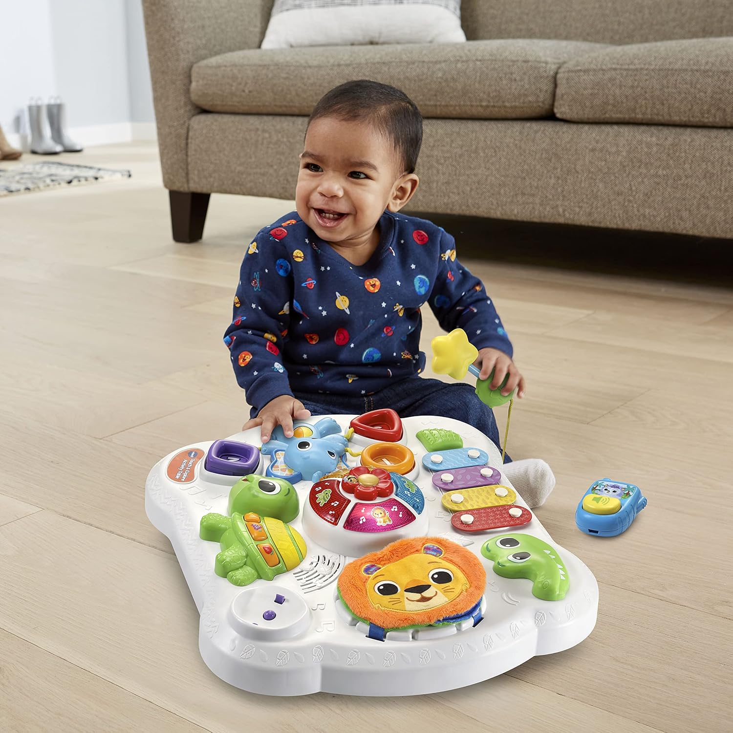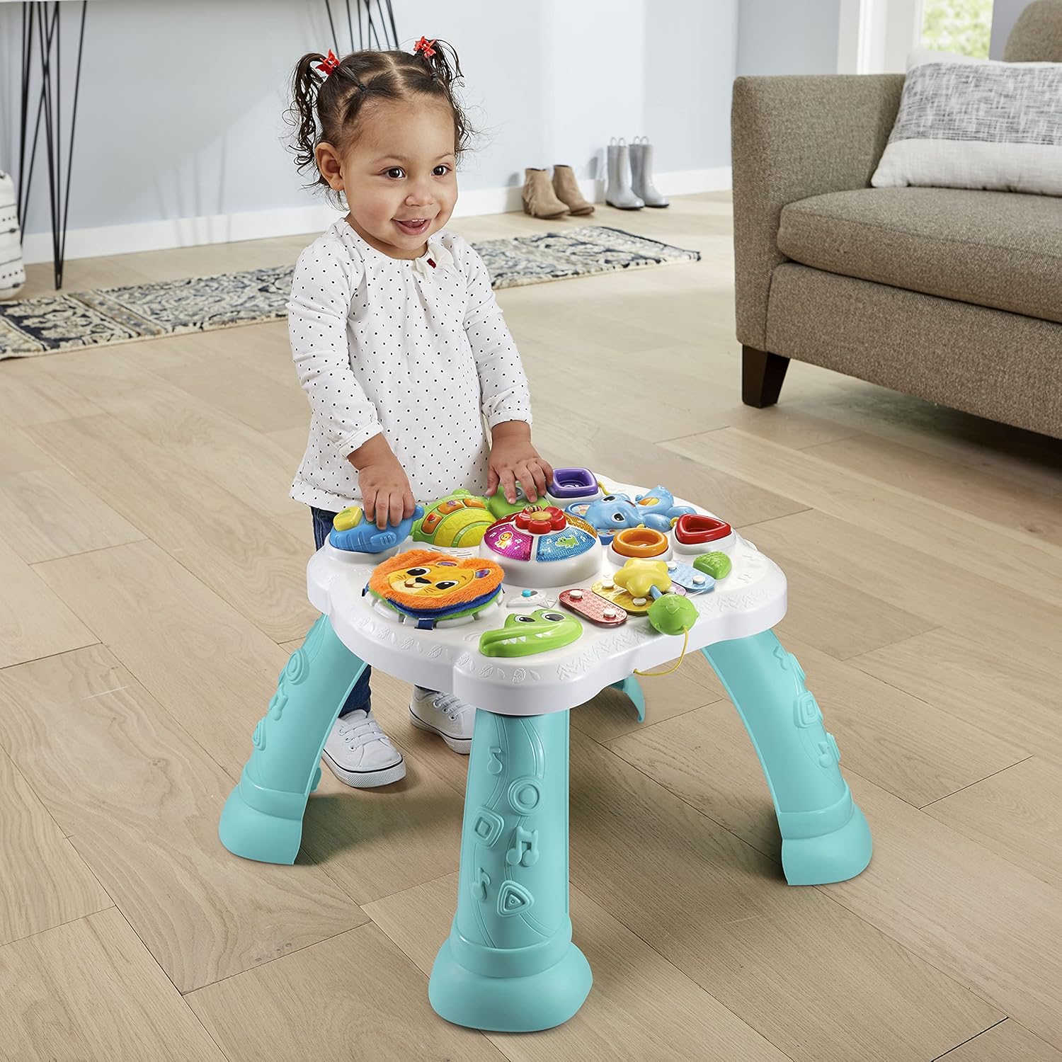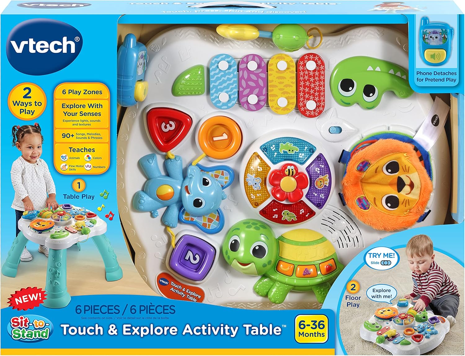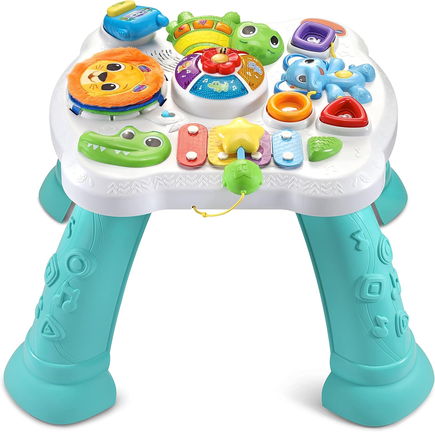 Discover six sensory play zones with the sit-to-stand Touch & Explore Activity Table™! Start with floor play, then switch to table play when your child can stand on their own. Activities on the interactive tabletop introduce kids to animals, colors and numbers with 90+ songs, melodies, sounds and phrases. Touch, press and spin to practice fine motor skills. An alligator xylophone helps inspire a love of music and includes an attached mallet. Spin the flower dial to the lion, elephant, turtle and alligator to hear animal fun facts, sounds and music. Stimulate your child’s sense of touch with the soft lion’s mane, bumpy-shelled turtle and the soft, crinkly pages of the fabric book. Three shape sorters help children learn to recognize circle, square and triangle shapes. A detachable play phone helps inspire imaginative play. It’s time to explore and so much more! Includes four removable table legs. Intended for ages 6–36 months. Requires 2 AA batteries. Batteries included for demo purposes only. New batteries recommended for regular use.