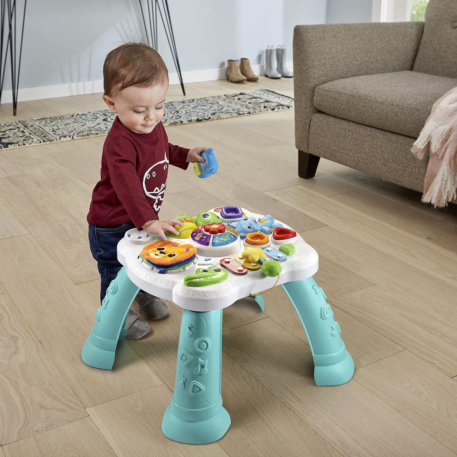 - Sit-to-stand activity table starts with floor play; add removable table legs when kids can stand on their own; six play zones enhance discovery.
