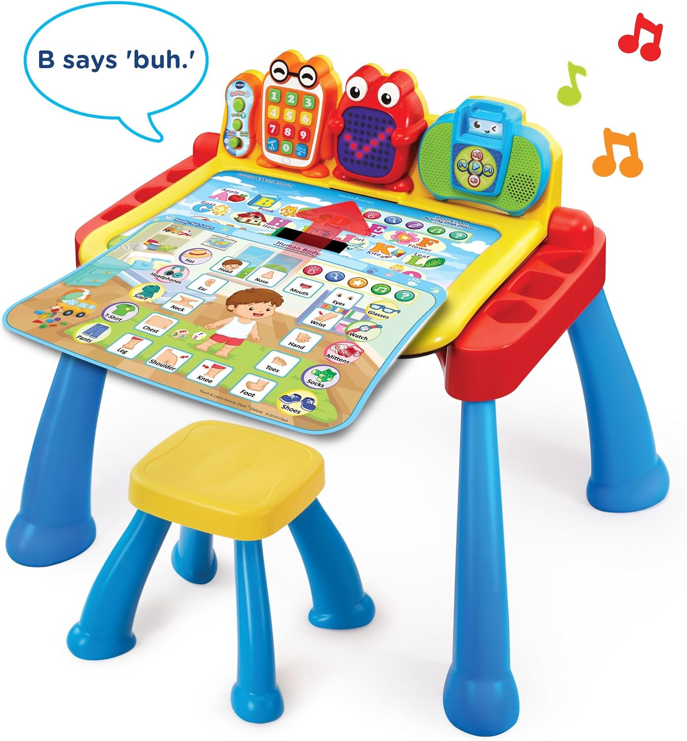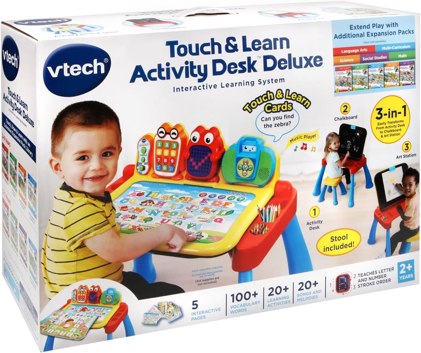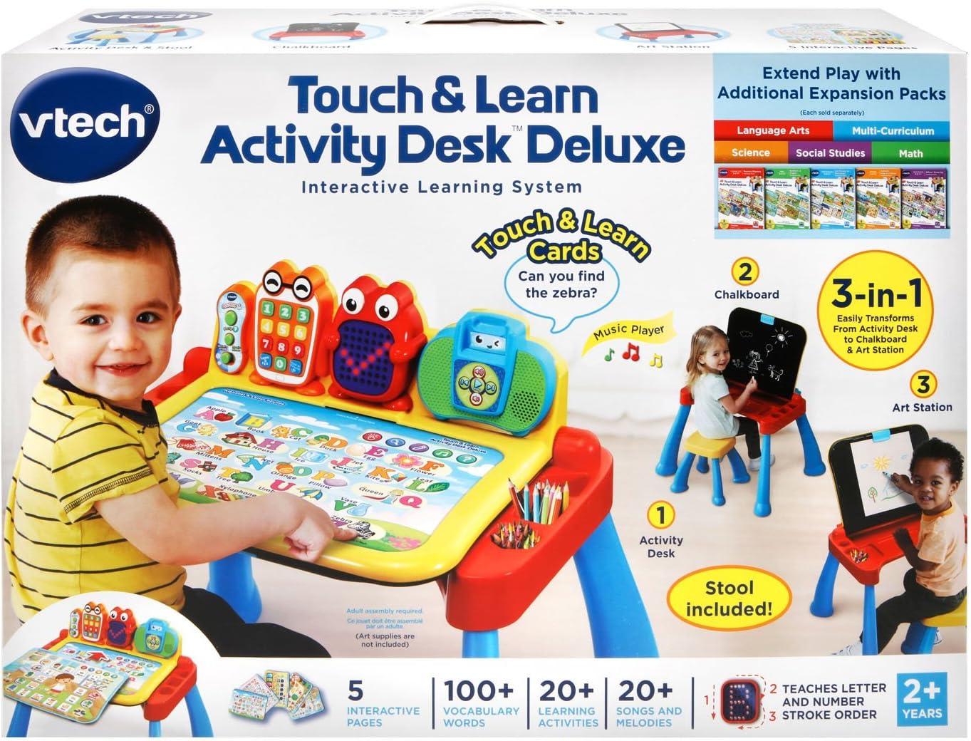 The Touch and Learn Activity Desk Deluxe by VTech is a three-in-one desk with interactive activity cards that's expandable for more fun and discovery! The desk features an interactive desktop and five pages to explore that are filled with engaging content including letters, numbers, music, colors and more. Choose from eight expansion packs (each sold separately) that each focus on a specific curriculum like nursery rhymes, reading skills, animals and numbers. It also transforms from a desk into an easel and chalkboard with plenty of storage space for art supplies to encourage play and discovery. The LED display illustrates letter and number stroke order and how to draw basic shapes. For even more fun, your toddler can play with the toy telephone or listen to fun tunes on the music player. Enjoy hours of fun as you create, discover and learn! Stool included.
