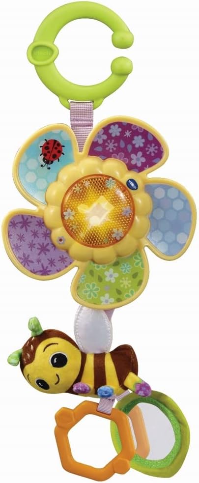 Introducing the Tug & Spin Busy Bee by VTech! This cute little bumble bee is great for on-the-go play. Bee's textured fabric provides tactile stimulation and encourages interaction. , , Pull down the honeycomb ring or leaf mirror to watch the flower spin and trigger fun phrases and sing-along songs, which encourage language development and watch the flower light up with the sounds. Take your bumble bee out and about with the C ring which easily attaches to pushchairs and car seats.