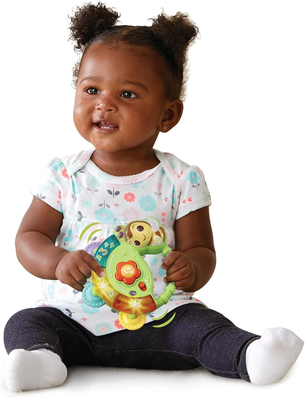Your baby will love making music with the Twinkle & Learn Tambourine. Tap the star button to learn numbers and hear playful phases and fun sounds. Shake it and hear real tambourine sounds when the electronics are off and hear playful phrases and sounds when they are on. The bird button also plays a variety of melodies. Plays 25+ sing-along songs, melodies, sound effects and fun phrases. Three flashing lights attract attention and the motion sensor encourages motor skill development.