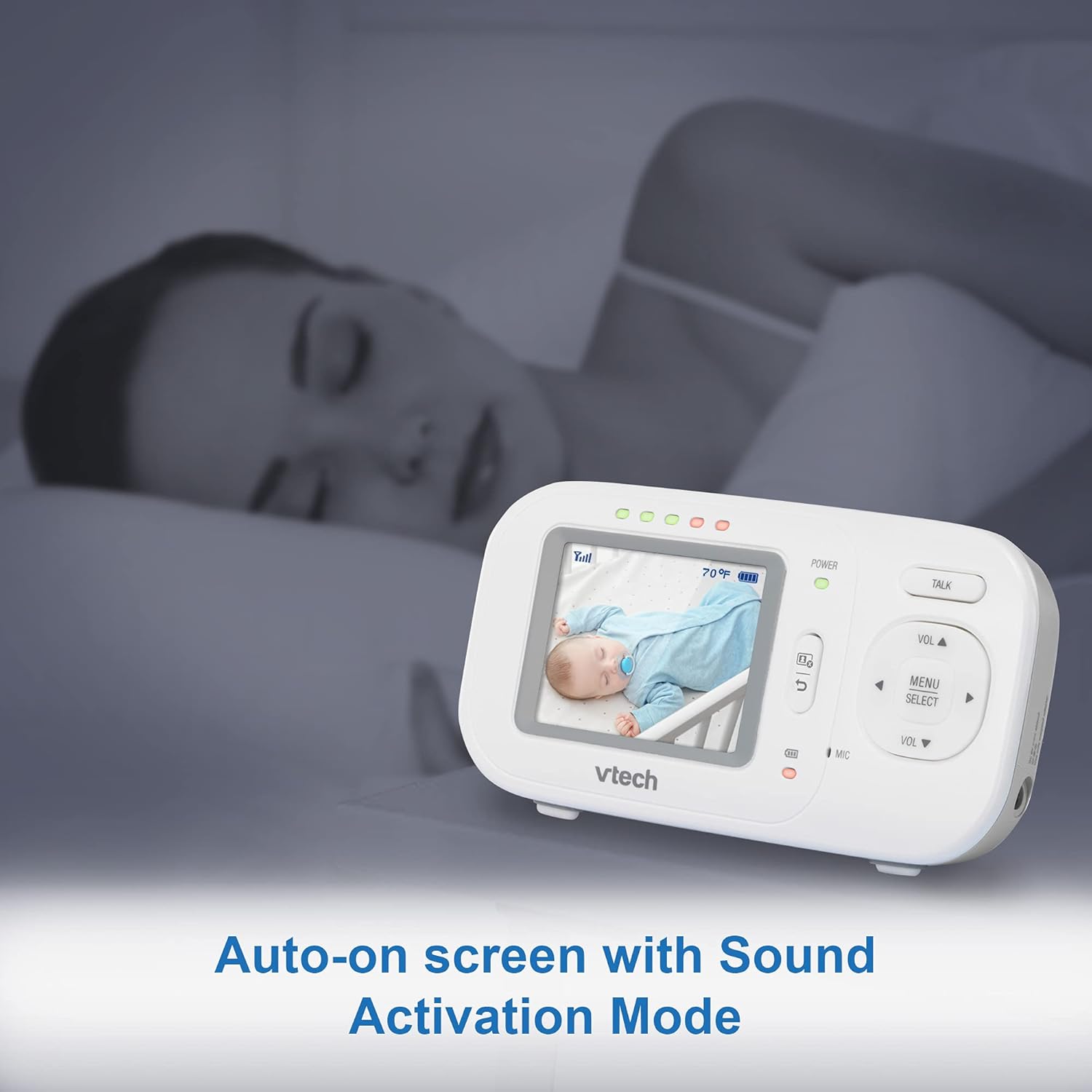 Auto-On Monitor with 5 Level Sound Indicator - Visually monitor the noise level of your baby's room via LEDs on the parent unit, while you enjoy a serene moment of silence. The screen can be turned off and sound muted to help save power consumption of the parent unit. When the sound exceeds your Vox settings, the screen will automatically turn back on.