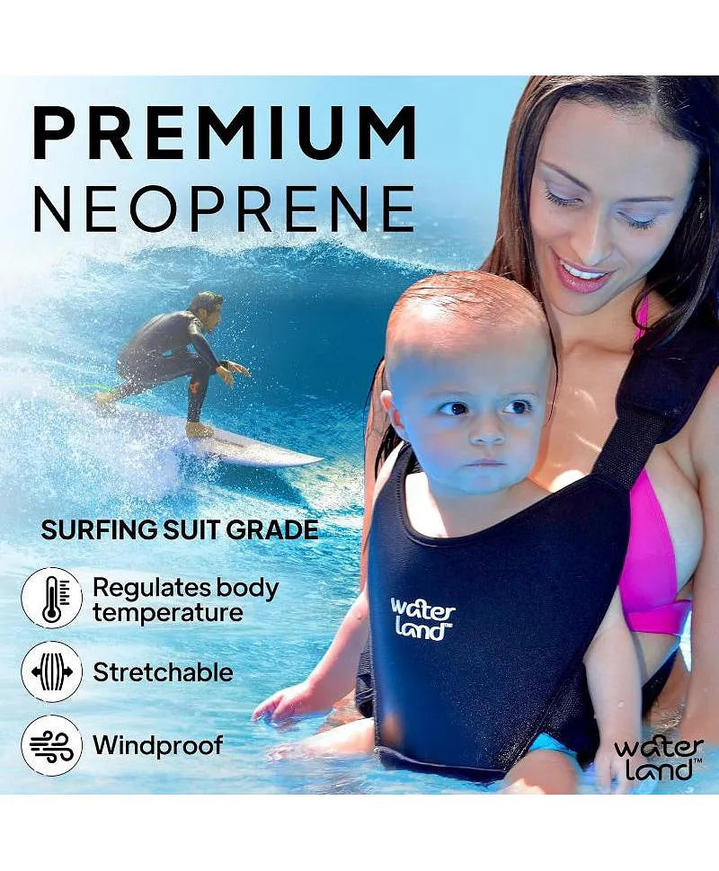 WaterLand guarantees comfort and security, enabling you to cherish every adventure together as a family. Explore our baby carriers in 7 vibrant colors. Each crafted to reflect your style and bond with your little one. WaterLand maintains your baby’s temperature in water with its innovative neoprene material. This ensures excellent insulation, keeping your little one warm against the wind and cold, whether they’re in or out of the water.You and your baby feel secure while in the water, and your hands are free and available.Easy to use – just adjust it once and wear it like a T-shirt! Padded shoulder straps. Easy-to-control safety buckles.It is the ultimate all-season baby carrier, perfect for days at the beach, pool, or even in the snow. Lightweight and easily stored and carried in travel bags.