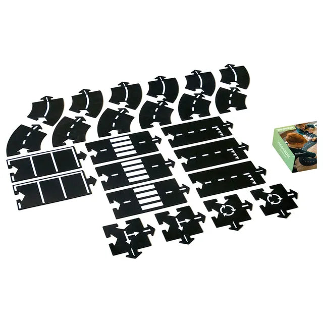 This Cars included Edition is a twist of our bestseller Highway. It got everything you need. As it includes 24 road parts and 1 very special car, To give the maximum amount of fun! If your child is a car lover, this is the set for you! With the 24 road pieces they can create many shapes and roads. And did you know the flexible toy road can be used inside or outside? Encourage imaginative play with an open ended toy. The wooden toy car has been designed by Floris Hovers, the car in this set is a special edition, zoom in to see the very cool coloured wheels.