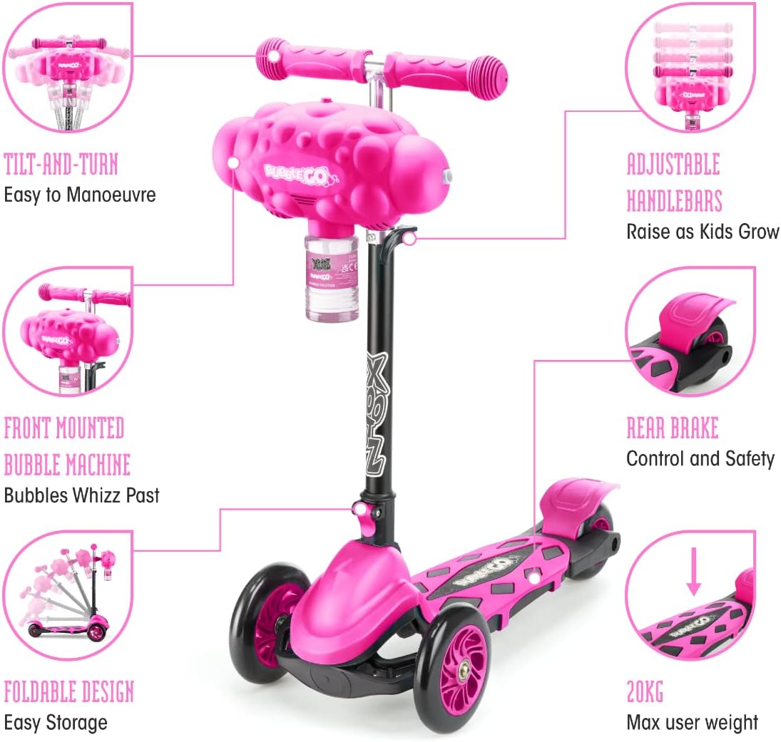 XOOTZ BUBBLE GO SCOOTER: The Xootz Bubble Go Scooter is a new way for kids to have fun. The front-mounted bubble machine lets your child enjoy the bubbles whizzing past them as theyƒ??re scooting around. Perfect Ages for 3+