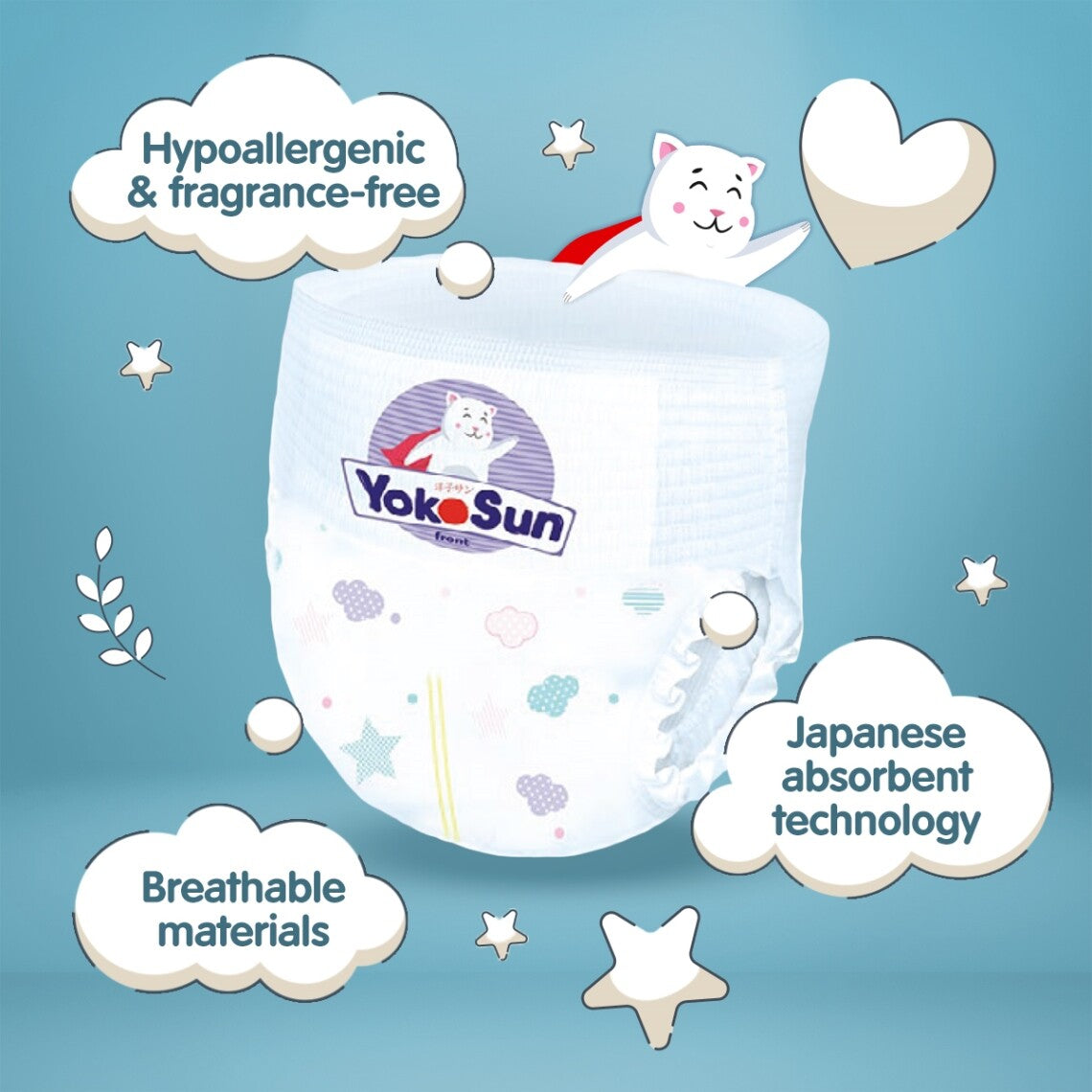- JAPANESE TECHNOLOGY & QUALITY: Crafted using advanced Japanese absorbent technology, Yokosun Baby Diaper Pants combine premium quality with exceptional care. Hypoallergenic and free from harmful chemicals, they are ideal for babies with sensitive skin, ensuring reliable protection both day and night.
