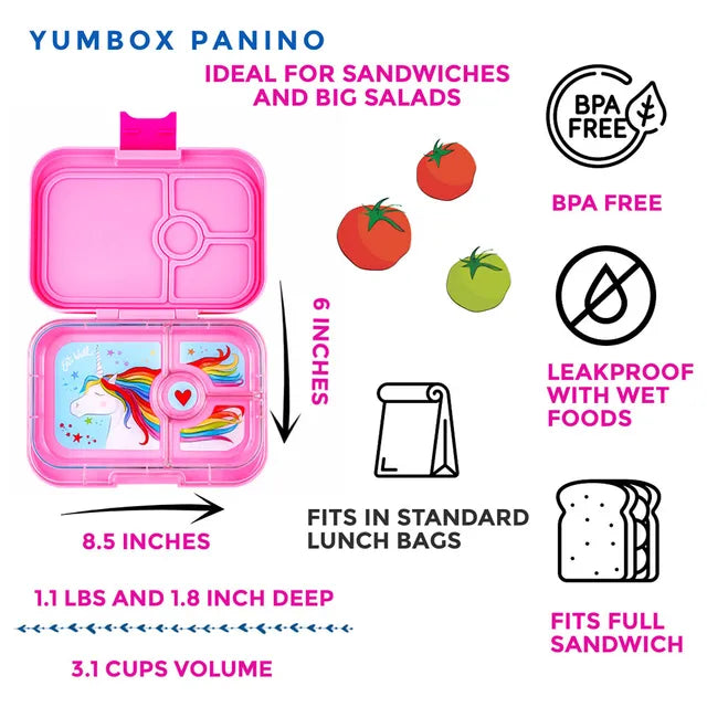 Yumbox Panino is your lunch time go-to for kids of all ages and adults. Pack a sandwich (crusts on), salads, sides and snacks. Yumbox Panino is holds more food than Yumbox Original for growing kids and adults. Prepare balanced healthy meals in minutes!