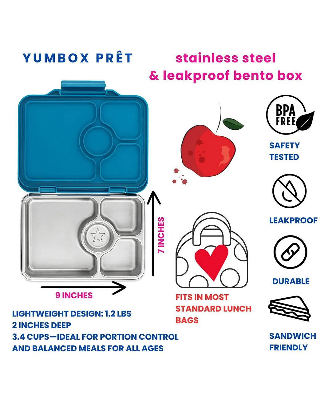 Introducing Yumbox Pret, the ultimate solution for leakproof sandwich friendly packed lunches made with durable stainless steel! This sleek and compact bento box is designed with the modern lunch-packer in mind, offering both style and functionality. Whether it's sandwiches, veggies, fruits, or dips, Yumbox Pr?¦t is perfect for keeping everything fresh and neatly organized.