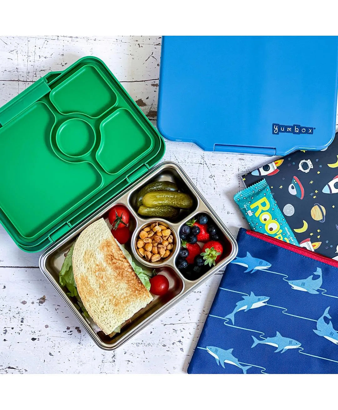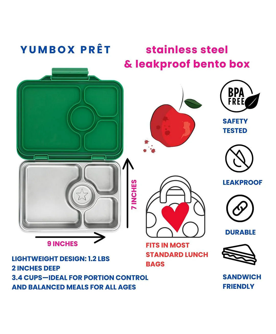 Introducing Yumbox Pret, the ultimate solution for leakproof sandwich friendly packed lunches made with durable stainless steel! This sleek and compact bento box is designed with the modern lunch-packer in mind, offering both style and functionality. Whether it's sandwiches, veggies, fruits, or dips, Yumbox Pr?¦t is perfect for keeping everything fresh and neatly organized.