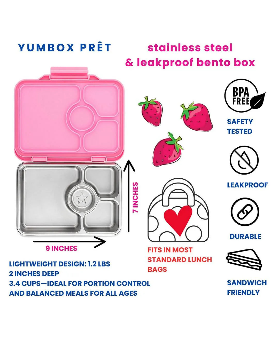 Introducing Yumbox Pret, the ultimate solution for leakproof sandwich friendly packed lunches made with durable stainless steel! This sleek and compact bento box is designed with the modern lunch-packer in mind, offering both style and functionality. Whether it's sandwiches, veggies, fruits, or dips, Yumbox Pr?¦t is perfect for keeping everything fresh and neatly organized.