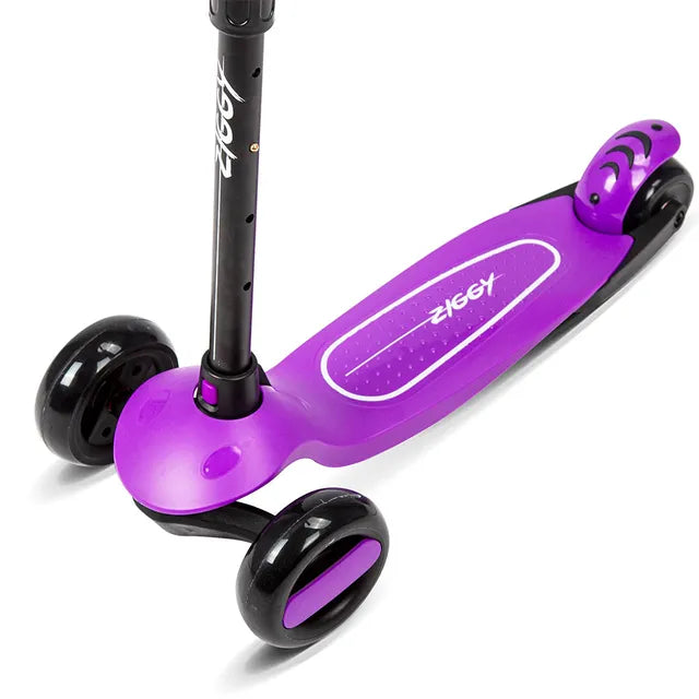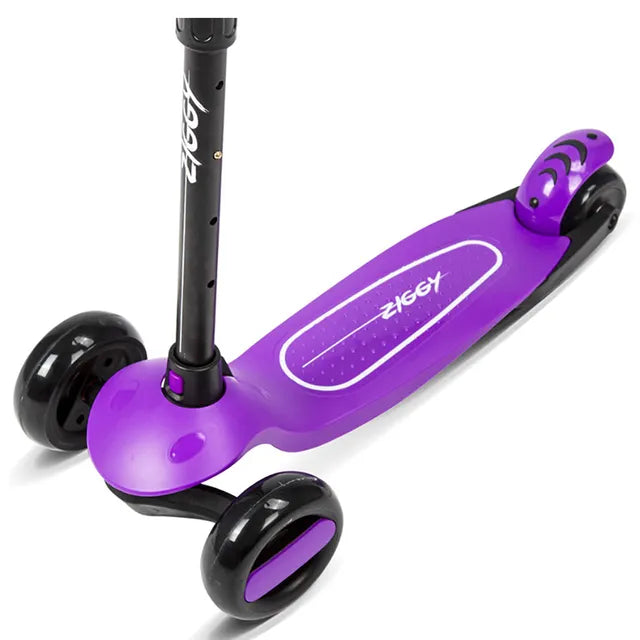 Introducing ziggy 3-wheeled tilt scooter created specially for kids attention design includes LED Wheels - 2 large front LED wheels and small rear LED PU wheels, ABEC-7 bearing, allows the children to glide stably, smoothly and quietly. Four adjustable height options for handle-bar, Lean-to-steer technology and lightweight design offer better control turning and maintain balance, Detachable handle-bar, lock it under the deck plate for easy storage and travel purposes